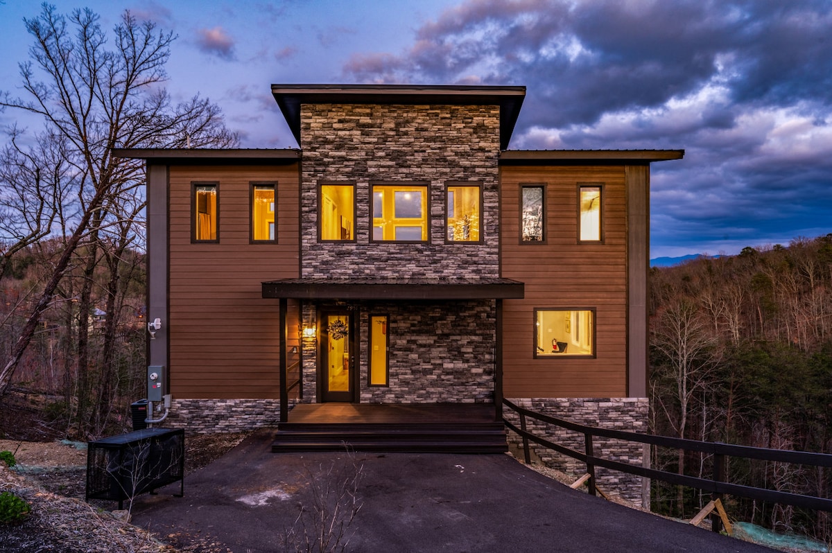 Experience BREATHTAKING mountain views from your own private slice of the Smokies! ★Honeycomb Retreat★ is a 5 star-rated modern-rustic style cabin located one of the most sought-after cabin resorts. ★ STUNNING Panoramic Views! ★ New Hot Tub ★ New Furnishings, Linen + High Quality Mattresses ★ King Suite + En Suite Whirlpool Tub ★ Pool, Fitness Area + Cantina (seasonal) ★ 400 mbps hi speed Wi-Fi ★ 7 mi Dollywood ★ 6 mi PF ★ 10 mi G-burg ★ 11 mi GSMNP