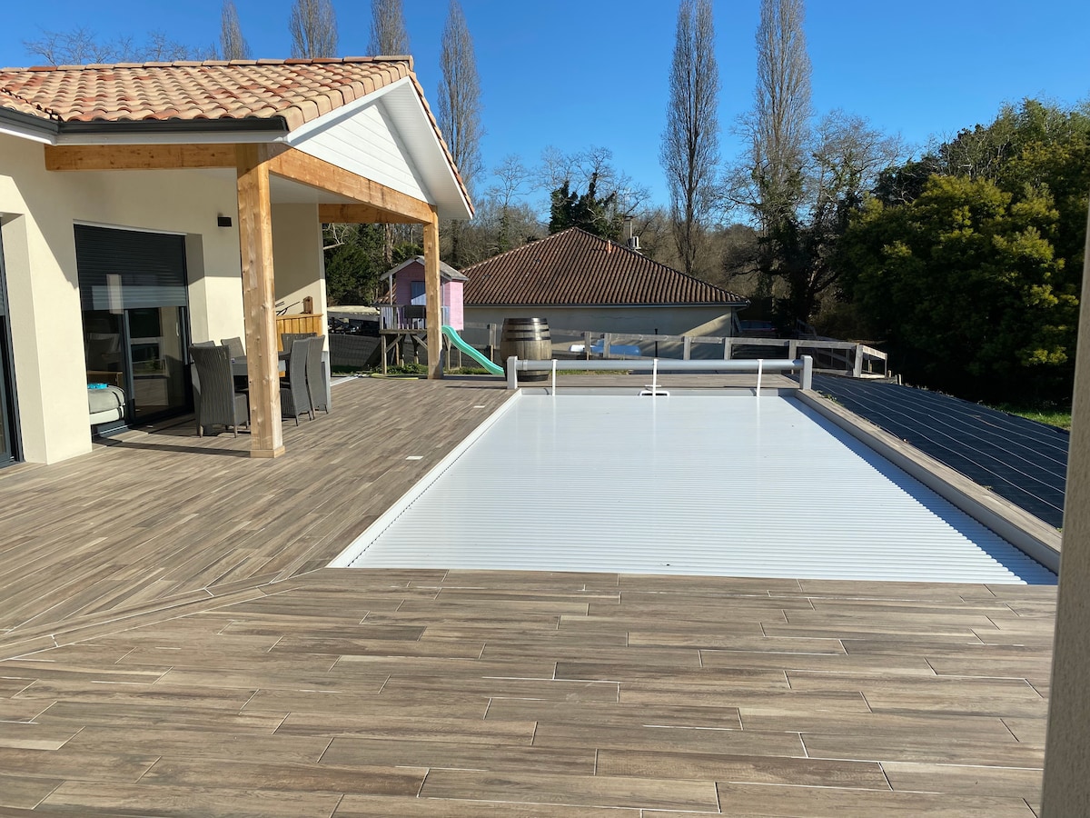 Casa nueva rodeada de bosque al lado del carril bici y las playas de la costa de las Landas Consta de una sala de estar con cocina americana, 3 dormitorios, incluyendo 1 suite principal con baño y aseo, y otro baño y aseo independiente. Fibra óptica 🛜 En el exterior, una piscina orientada al sur de 4 x 8,5 m climatizada de abril a 11 de noviembre con jardín paisajístico y 110 m2 de terraza de madera. Playa y golf de Moliets y Maa a 10 minutos Vieux Boucau a 15 minutos Hossegor a 28 minutos. Biarritz 50 min