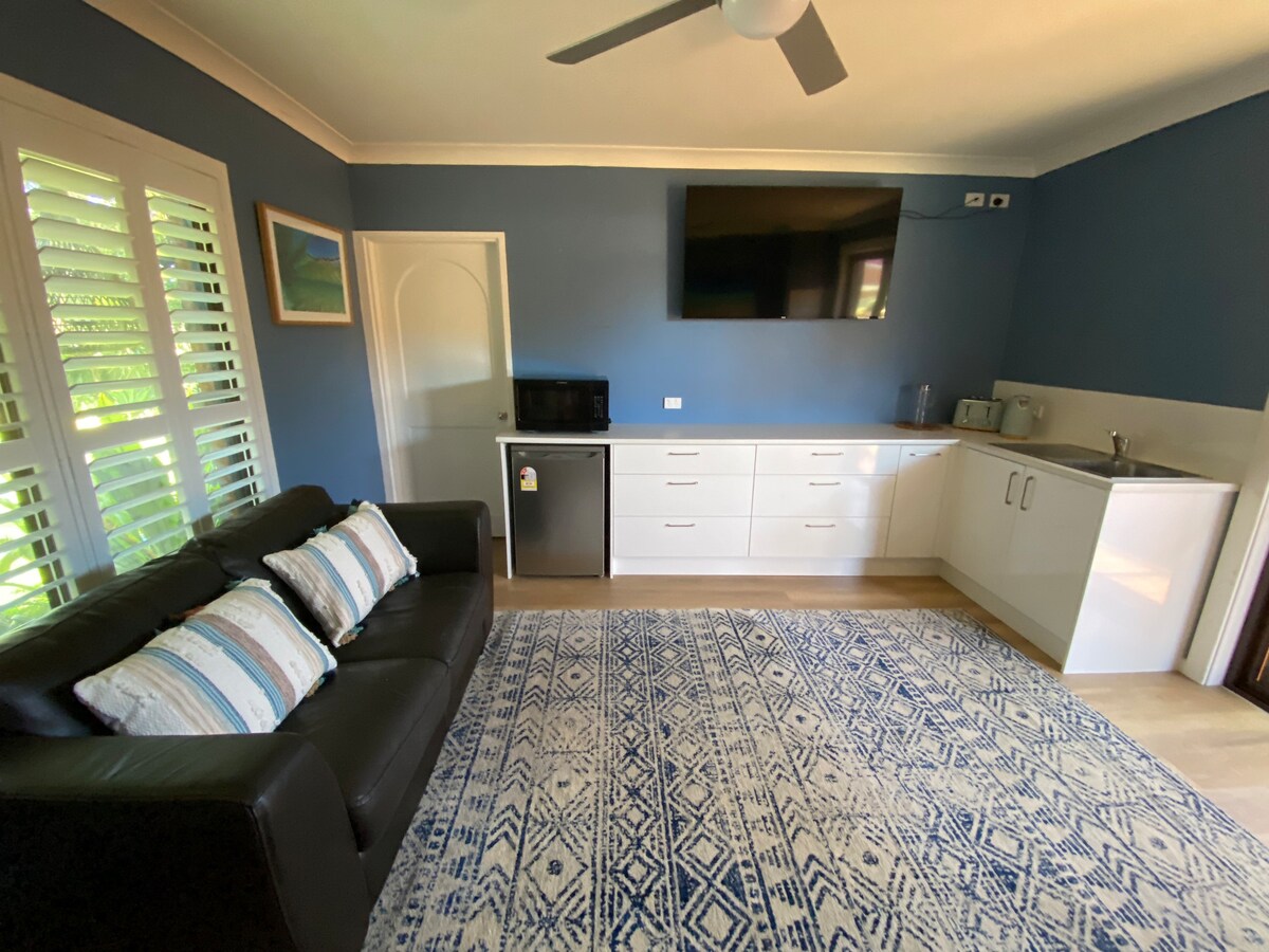 Situado en 48 hermosas hectáreas ondulantes de granja de aficiones. El estudio independiente ofrece un espacio privado moderno, elegante, cálido y cómodo. Internet NBN rápido ilimitado con Netflix. Costa norte media a 2 horas y a 40 minutos al norte de Sídney y a 20 minutos de Blackhead Beach o a 45 minutos de las playas prístinas de Boomerang y Bluey. La estancia incluye un desayuno continental de pan recién horneado casero y mermeladas y granola y algunos huevos reales de corral.