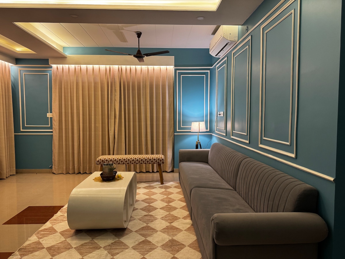 Welcome to Aura Luxe by The Sleepy Monkey. Centrally located 2BHK apartment on Tonk Road, Jaipur, just walking distance from Gandhi Nagar Railway Station and 12 minutes from Jaipur Airport. This luxury flat features a 120-inch projector screen with JBL Dolby sound, creating a private home theatre experience. Whether you want to enjoy Movies, Netflix and Chill, Cricket, Football or anything else - we've got you covered. Ideal for families, business travelers, couples, and small groups.