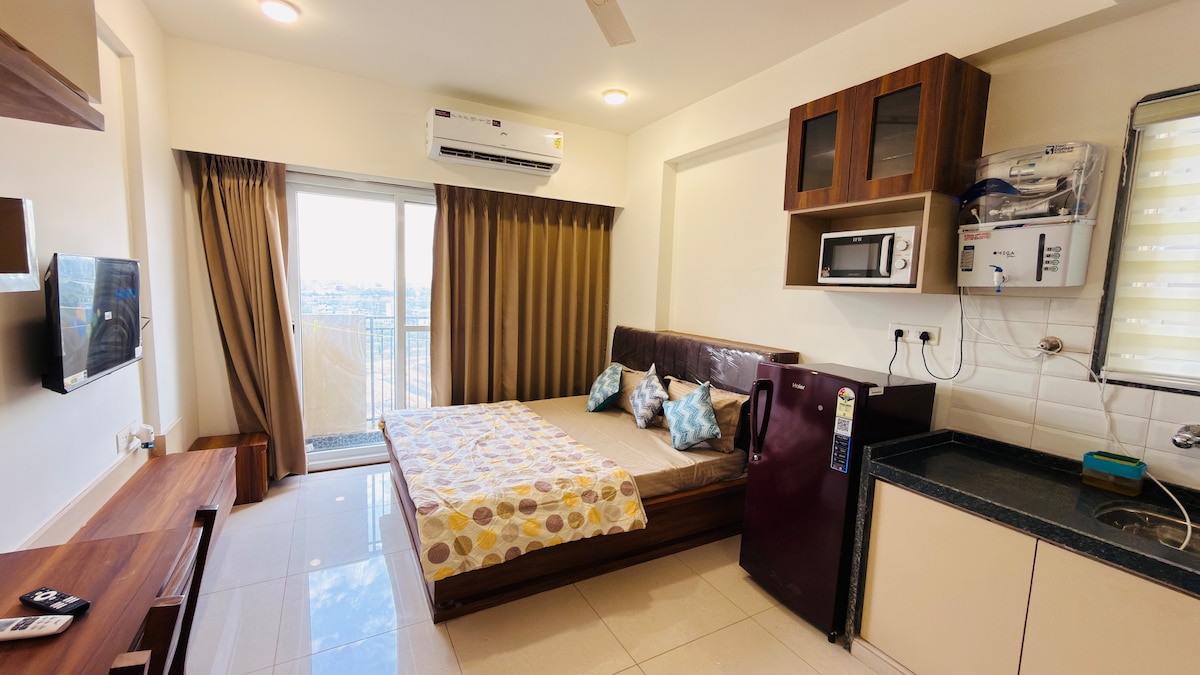 Pet Friendly Cozy Studio Apartment in Ashadeep Rainbow – Near Bombay Hospital in Pink City Jaipur Perfect for business travellers, solo visitors, Medical travellers visiting Bombay Hospital. Digital nomads & students and couples seeking a comfortable stay. Highlights: ✅ Well-Equipped Kitchen ✅ Smart TV and Free WiFi ✅ Queen Size Bed, Air Conditioning & Geyser ✅ Secure Gated Community ✅ Ample Free Common Parking Space Close to the airport, Sitapura Industrial Area & attractions.