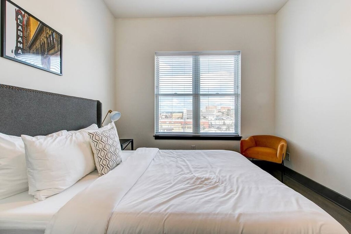 Escapada elegante en el corazón de Birmingham – A pie de UAB y Five Points South Descubre tu estancia perfecta en la Ciudad Mágica en este moderno refugio en el octavo piso con impresionantes vistas volcánicas con vistas al histórico Five Points South. Ubicada a pocos pasos de la Universidad de Alabama en Birmingham (UAB) y a minutos de las atracciones del centro de Birmingham, esta elegante escapada ofrece la combinación ideal de comodidad, conveniencia y sabor local.