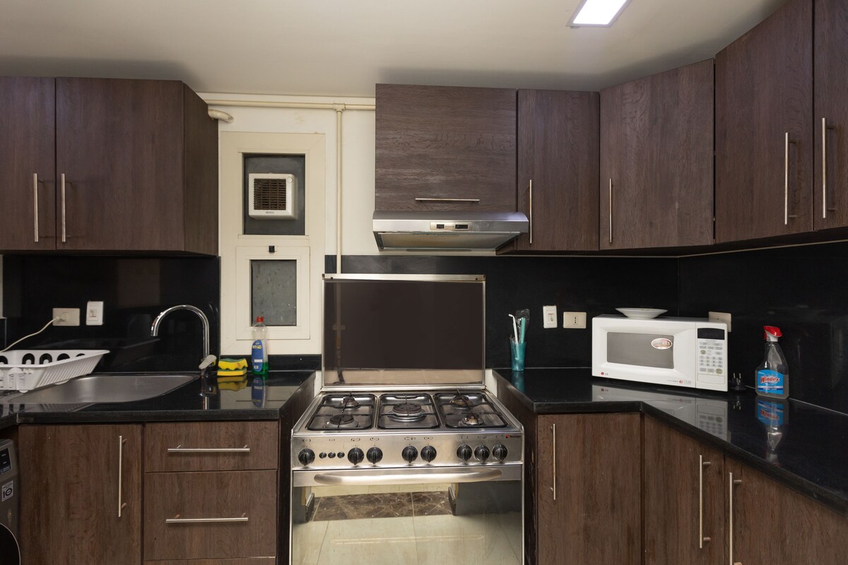 Bienvenido a tu hogar, adecuado para estancias cortas y largas. Nuestro espacioso apartamento de 2 dormitorios está a solo 5 minutos del aeropuerto de El Cairo. El dormitorio principal cuenta con una cama tamaño king y una cuna para tus pequeños (de 0 a 8 años). El segundo dormitorio tiene dos camas medianas. TV de 50 pulgadas (Netflix incluido) cocina totalmente equipada con todo lo que necesitas, desde una estufa de gas hasta microondas y hervidor de agua. Relájate en el balcón con una hermosa vista al árbol o camina solo un minuto hasta supermercados locales, panaderías y muchos más.