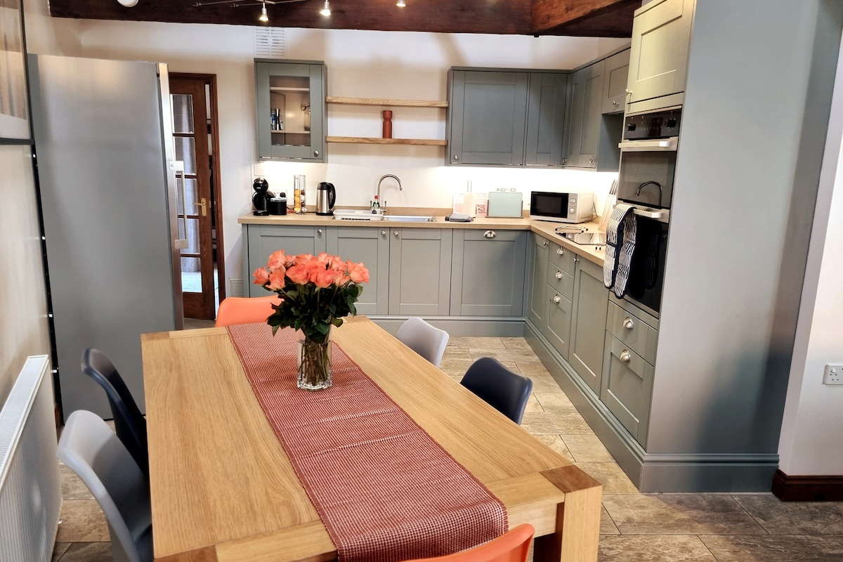 Durante más de cien años, esta antigua lechería con carácter fue donde se ordeñaban las vacas en Hawthorn Farm. Reformada con gusto y lujo en una casa de campo de dos dormitorios en 2017, es independiente y completamente separada. En el interior, las paredes originales, las vigas y los techos abovedados le dan una sensación espaciosa y aireada. Tiene su propia cocina americana totalmente equipada y un baño con una gran ducha, inodoro y lavabo. La espaciosa sala de estar alfombrada de 18 x 14 pies tiene dos enormes sofás cómodos y una mesa con sillas.