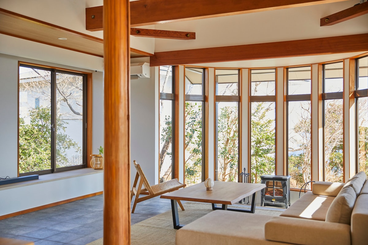 Experimenta los extraordinarios sonidos de la naturaleza en una casa de campo con vistas al mar. Hay una casa de campo en el parque nacional de Tanushi, pasando por el punto de poder Heart Cave Ryugu (modelo para "Ponyo" de Ghibli), y la playa de Tanushi. Al entrar por la puerta principal de la cabaña, el verde de los árboles y la luz brillante del océano saltan en tus ojos.El salón de 20 tatamis con techo alto tiene un sofá, cocina, loft y chimenea en invierno, y es un espacio relajante para familias y amigos. Cuando sales por la ventana a la terraza, puedes ver el cielo y el mar extendiéndose desde el mar.Puedes sentir lujosamente la cómoda brisa y el cielo que fluye lentamente en el jacuzzi y la hamaca. Desde la terraza, sube un tramo más de escaleras hasta la plataforma de observación.Solo hay naturaleza hasta donde alcanza la vista.El paisaje impresionante se extiende. El flujo relajado del mar y los barcos de pesca en Izu, puedes escuchar el sonido de los pájaros en el arroyo.Es una gran desintoxicación. Luego, baja un piso para disfrutar de una barbacoa de carbón mientras escuchas el murmullo del río en el bosque.Fue delicioso, divertido y un gran recuerdo. Por la noche, el cielo estrellado es deslumbrante, y si hace buen tiempo, ¡puedes ver estrellas fugaces!Puedes disfrutar de la belleza del cielo.
