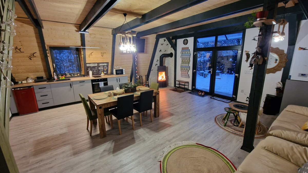 Bienvenido a nuestra acogedora cabaña de madera con estructura en A, ubicada en hermosas montañas. Disfruta de la paz de la naturaleza con un río y exuberantes bosques a un corto paseo de distancia, además de un gran parque infantil cerca. Alójate cerca del animado pueblo mientras saboreas la tranquilidad del campo, con caballos, vacas y ovejas amistosas pasando por allí. ¡Tu escapada perfecta te espera!