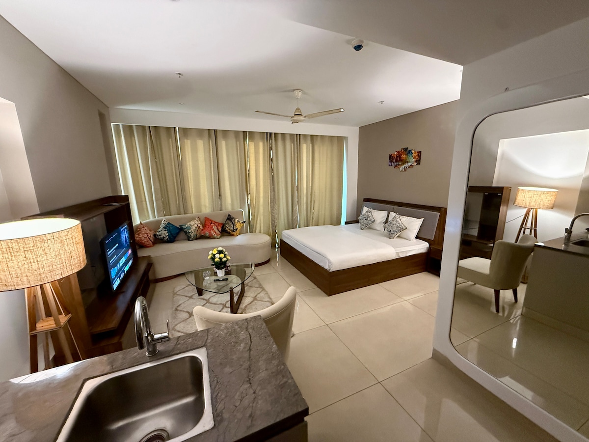 Nuestra lujosa y cómoda suite de diseño estético con terraza con vistas al exuberante parque de biodiversidad, a solo 20 minutos del aeropuerto, es una opción perfecta para parejas para una estancia tranquila y relajada de lujo privada. TV inteligente de 55 pulgadas, barra de sonido JBL 9, iluminación ambiental, baño de lujo, terraza privada ajardinada, bar, comedor privado, colchones de látex y un enorme espejo en la cabecera hacen que parezca extremadamente sensual. Cerca de excelentes restaurantes, bares populares, cafeterías y spas a 10-15 minutos a pie.