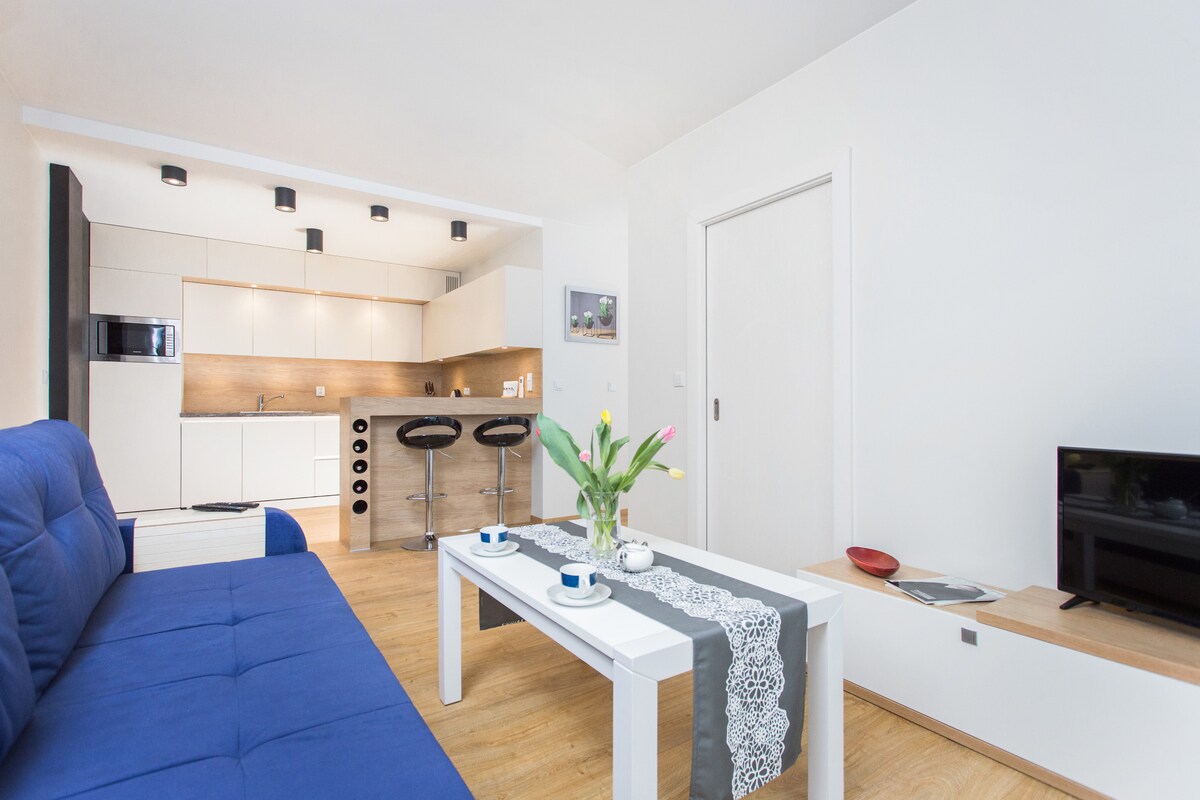 Apartamento moderno en el centro de Cracovia - Aleja 69. Interior elegante, cama cómoda, cocina totalmente equipada y un lugar para relajarse en un balcón privado. Wifi rápido, aire acondicionado, TV, lavadora, aspiradora, lavavajillas y un juego de cosméticos para los huéspedes. Excelente ubicación: a 5 minutos a pie de la plaza del mercado, cerca de Wawel y Kazimierz. Restaurantes, tiendas y transporte público cercanos. Posibilidad de registro automático. ¡El alojamiento perfecto para alojarte en Cracovia!