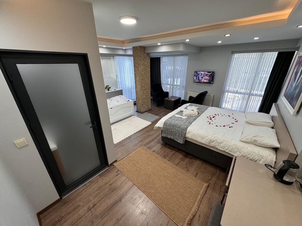 Las suites de lujo son residenciales. Nuestro apartamento tiene jacuzzi en el balcón Nuestros clientes pueden utilizar las instalaciones del hotel fácilmente. La piscina, el gimnasio y la sauna tienen un coste adicional. El apartamento tiene un aparcamiento separado y es gratuito El lugar está justo al lado del mar y tiene una hermosa vista al mar. El metro está a poca distancia Este apartamento tiene una vista al mar excepcional, donde puede disfrutar de la puesta de sol desde su sofá y dormitorio.
