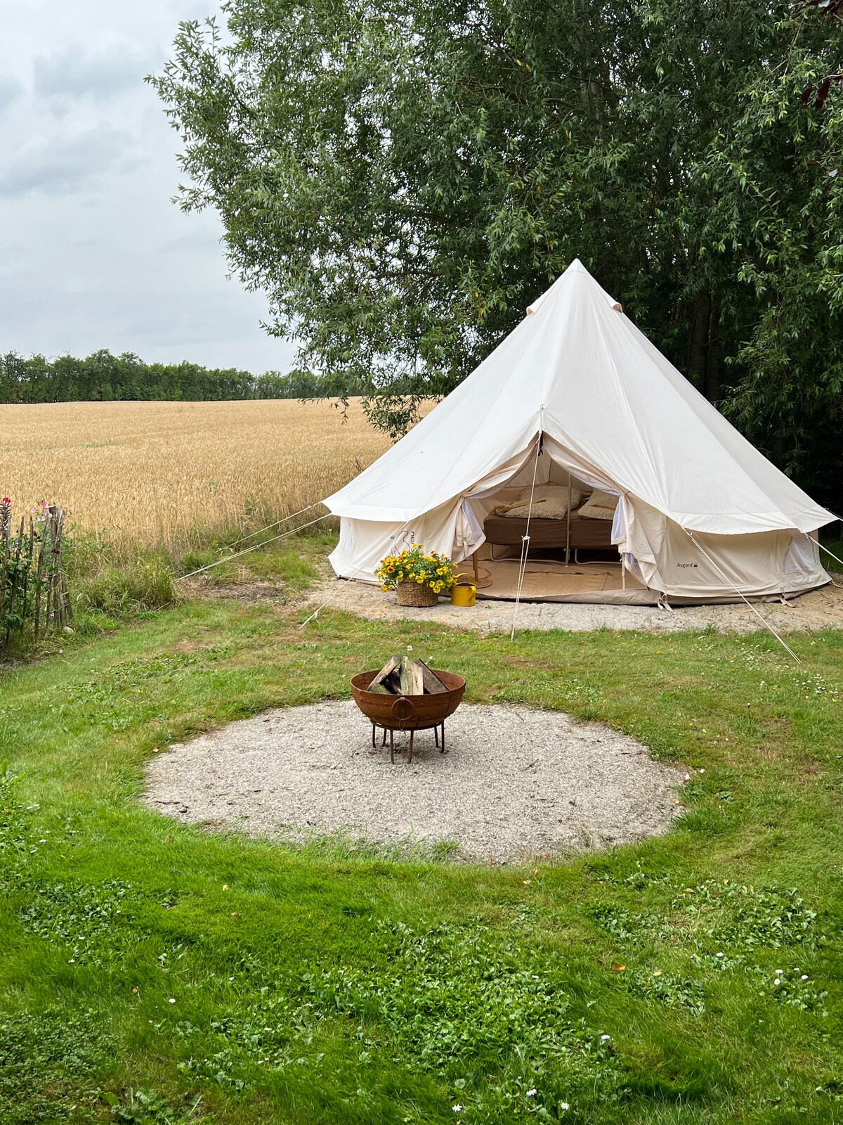 Tienda de campaña glamping con vistas al campo y al pequeño estanque del jardín