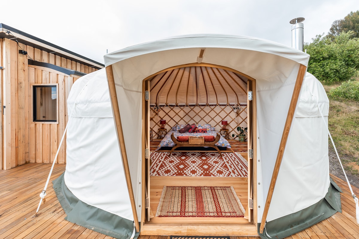 Ubicadas en un olivar con vistas al famoso cabo Fluted de la isla Bruny, nuestras yurtas ofrecen la mejor experiencia romántica de glamping, con baño privado y cocina, así como un baño al aire libre y un pozo de fuego para contemplar las estrellas. Cada yurta está amueblada con artículos vintage recogidos de todo el mundo, una chimenea interna de leña, suelos de madera y paredes forradas de lana para noches acogedoras. Las ventanas de doble acristalamiento dan al bosque y al bosque circundante que rodea 360 grados alrededor de nuestra granja.