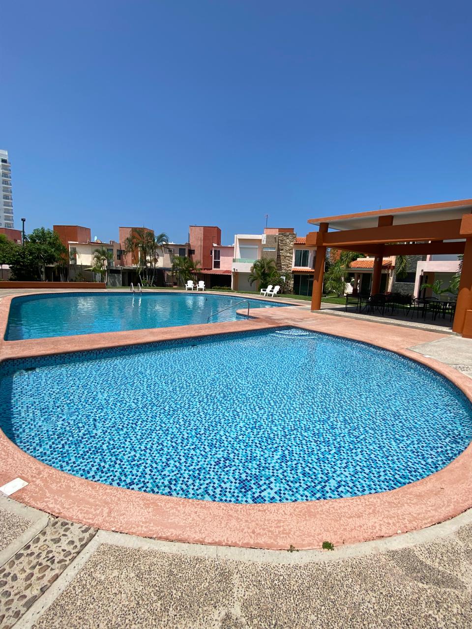 Alojamiento(casa dos pisos) tipo villa, en fraccionamiento ubicado a la orilla del mar, tiene tres recámaras (2 camas king size y 2 individuales), 2 1/2 baños, TV (sala y recámara principal), cocina (estufa, refrigerador, horno de microondas, licuadora y utensilios para cocinar), aires acondicionados (recámaras y planta baja), Internet, 3 Albercas compartidas y finalmente 2 espacios para vehículos. Complejo residencial privado con control de acceso y muy seguro
