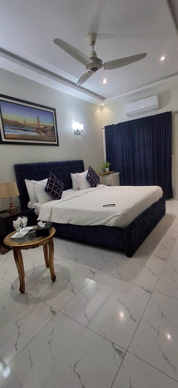 Spacious Executive Suite in DHA Phase 8 with an upgraded boutique finish and extra comfort. King bed, sitting area, fast Wi-Fi, smart TV, minibar/fridge, safe and a luxury ensuite—perfect for longer stays and work travel. 24/7 support; RFID key-card access at check-in.