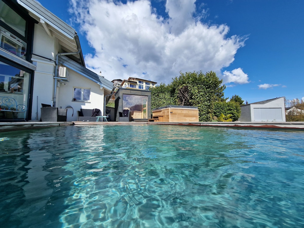 Estudio independiente en nuestra villa familiar. Espacio de oficina ideal para el teletrabajo. Tranquilidad y impresionantes vistas de los Alpes suizos y el viñedo. Senderismo y pistas de esquí en las cercanías. Parada de autobús frente a la villa. Piscina accesible de 9:00 a 22:00 (de mayo a septiembre) Cocina totalmente equipada. Se proporcionan toallas y sábanas. Plaza de aparcamiento incluida Estación de carga para coches eléctricos. Cuna adicional ( 30 CHF por alquiler) ofrecido los alquileres de un mes
