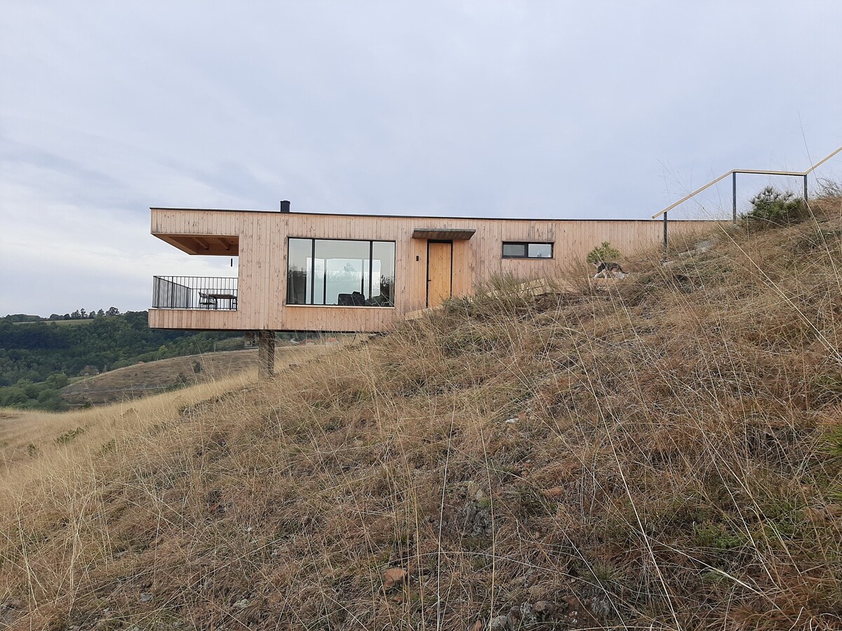La casa está ubicada en la colina con bonitas vistas. Diseñada para que dos personas disfruten de la arquitectura moderna y la naturaleza.