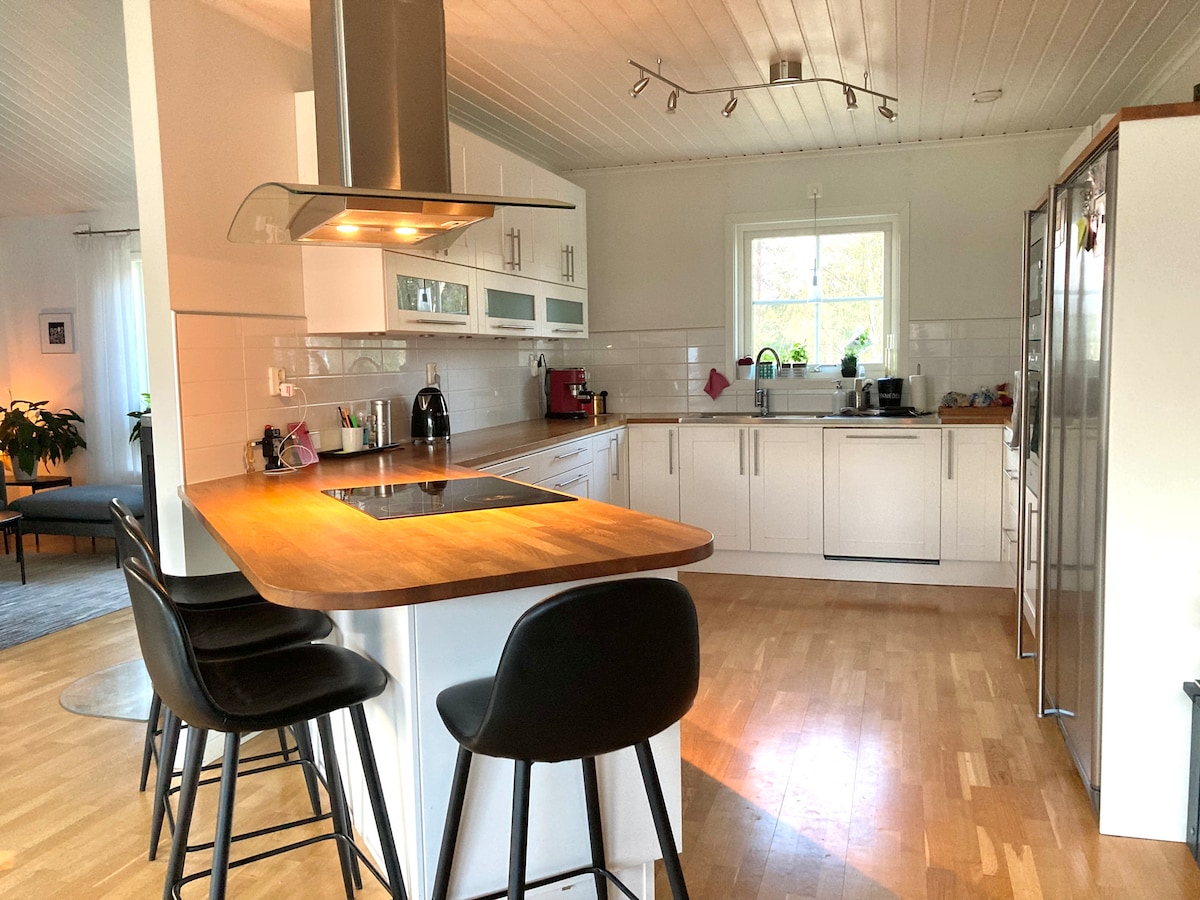 En helrenoverad villa (2022) med hög standard, fina och tysta rum. Passar företagare/familjer/kompisgäng , som uppskattar fint boende i en lugn o tyst omgivning. 10 minuter till city. Bra bussförbindelser. Golvvärme i hela huset och köket har dubbla vitvaror av allt. Fullutrustat kök o fullt möblerat. Hotellstandard på sänglinnen & handdukar. Kommer ni med flyg, buss eller tåg? Transfer kan ordnas. Stor stenlagd uteplats med gasolgrill & matgrupp/lounge , paviljong. We speak Swedish and English