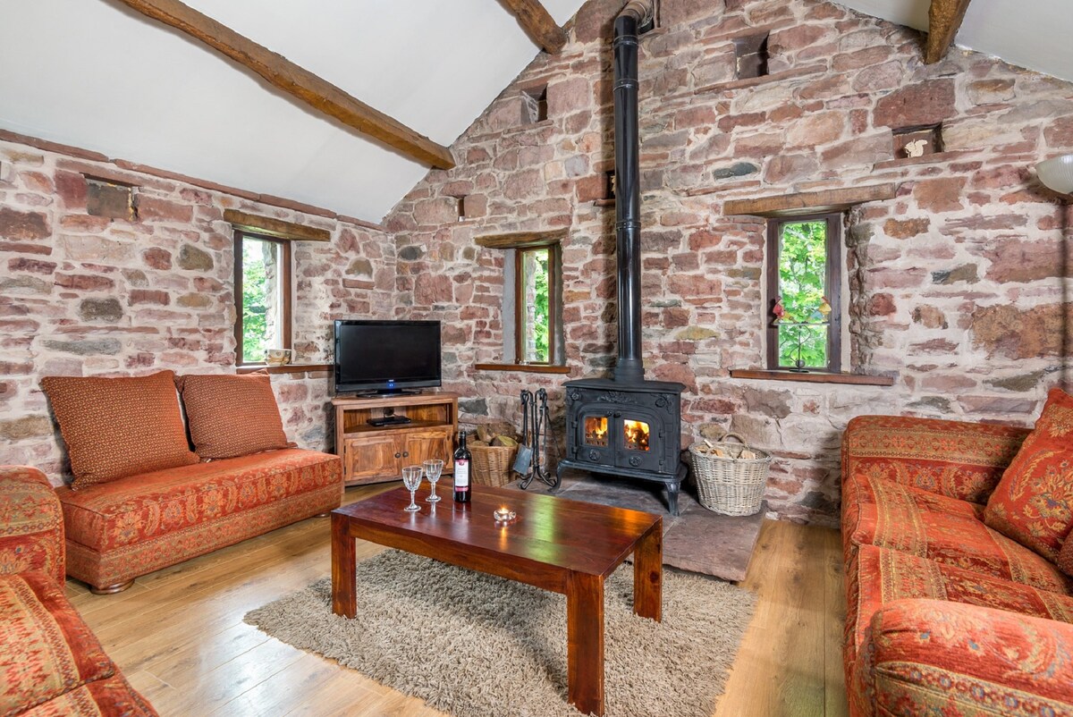 This 17th-century barn conversion is full of character, featuring exposed beams and stonework throughout. Upstairs, there is an open-plan kitchen and living area with a wood-burning stove, overlooking surrounding fields. An outdoor balcony provides a lovely space to relax and enjoy the view. The property also offers a wood-fired sauna with indoor hot and cold showers, which can be booked separately. An on-site café and coffee shop are just a short walk away. Dogs are welcome by arrangement.
