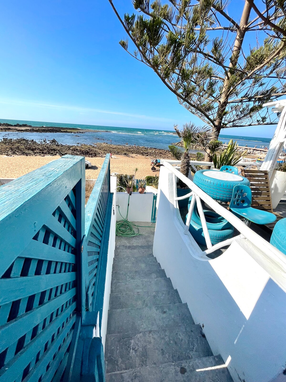 Cabaña en el agua en la playa de Skhirat. Arte, decoración atípica y una terraza muy grande con impresionantes vistas a la playa de Skhirat le ofrecerá una sensación de cambio de escenario total. A su disposición: -la gran terraza -2 salones -3 habitaciones dobles + 1 habitación para personal en el exterior -2 baños - cuidador y trato H24 Tiendas cercanas (2 min a pie). A 25 km de Rabat. Tenga en cuenta que en invierno, la terraza está renovada. El acceso a la playa es directo.