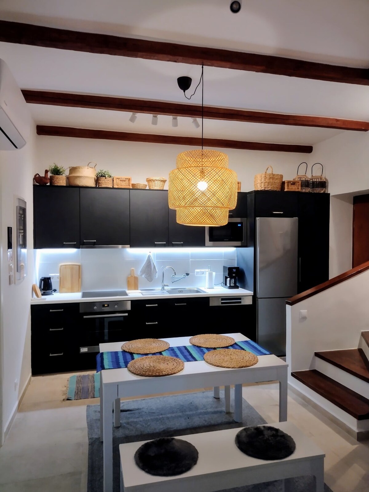 La casa está construida en piedra con la arquitectura tradicional de Mani con una suave iluminación en el jardín, los alrededores y la barbacoa. Iluminación ideal dentro de la casa y las terrazas.