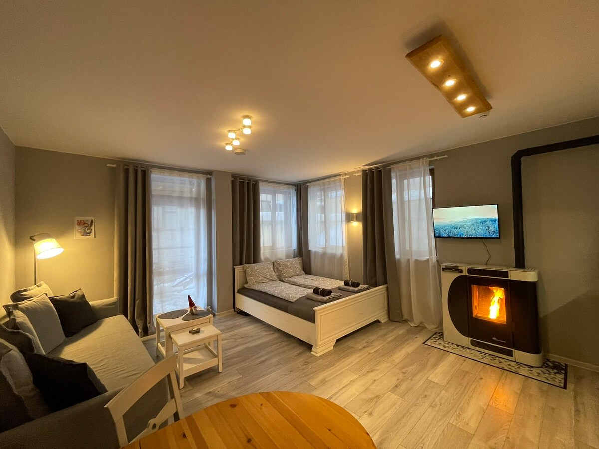 Cuidadosamente, práctico y amueblado de diseño, el estudio tiene todo lo que necesitas para un colchón completo para descansar: colchón, almohadas ortopédicas o altas, ropa de cama ligera, chimenea romántica, electrodomésticos modernos, cocina totalmente equipada con mesa de comedor, cómodo sofá que se convierte en cama, amplio baño, Internet de alta velocidad y vista de los bosques de pinos desde el balcón. ¡Se encuentra en la primera planta (no en la planta baja) y tiene su propia salida al jardín! El aparcamiento está justo al lado de la entrada del edificio.