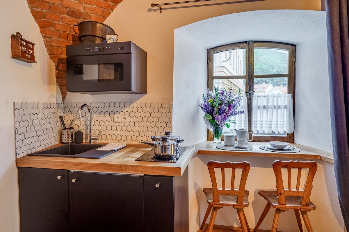 El apartamento n .º 1 está ubicado en la planta baja de una casa histórica n .º 126, en el centro de Lokt. La casa está junto a la Torre Negra con vistas a las paredes del castillo. El apartamento de diseño recién renovado está totalmente equipado para 2 personas, incluye una cama doble, una cocina totalmente equipada con un horno y una placa de cerámica, y una zona de estar para dos personas. El baño incluye una bañera y una cómoda calefacción por suelo radiante. Las comodidades incluyen TV por Internet, wifi, sábanas, toallas y farmacias.