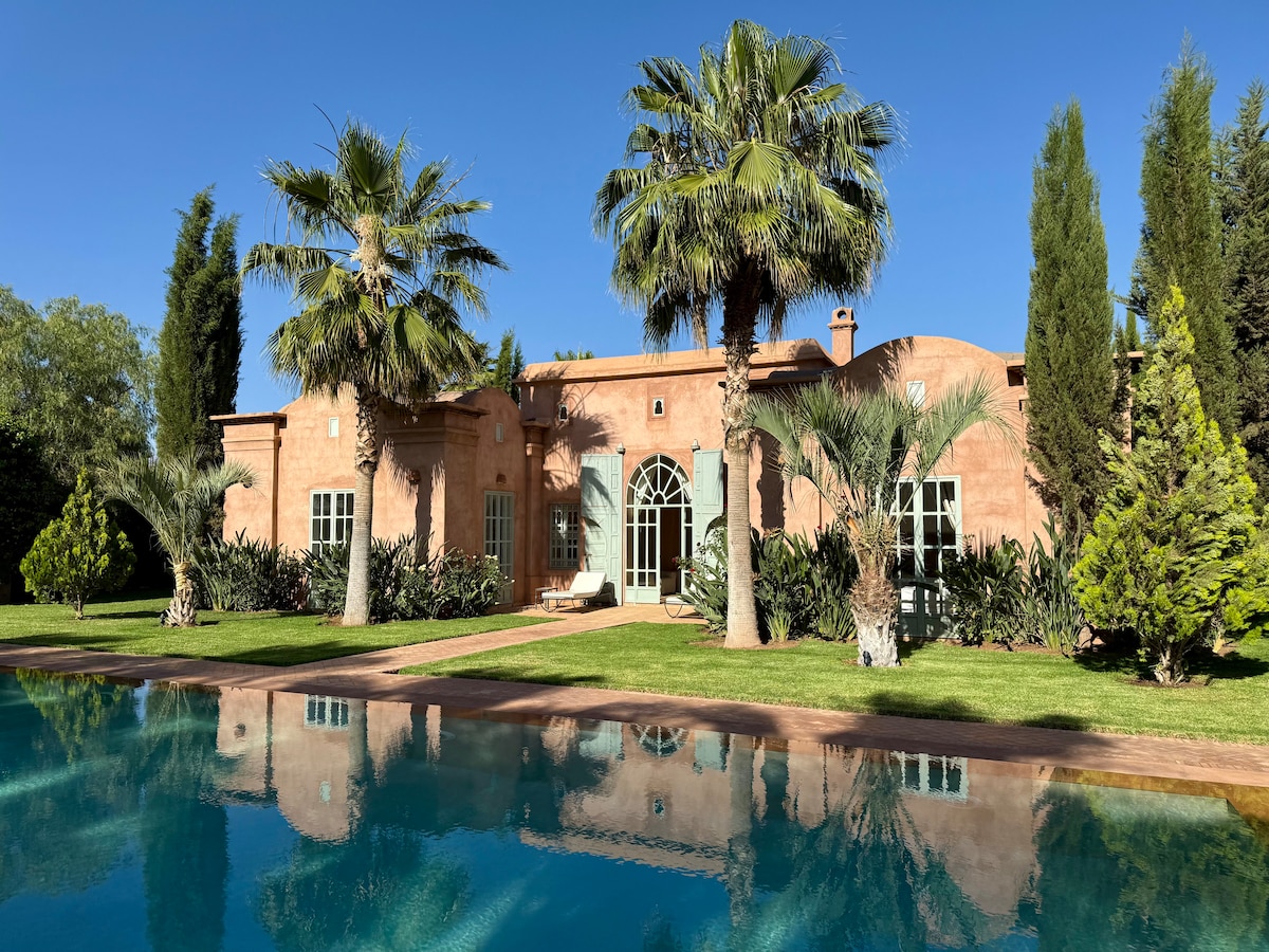 Villa situada a 30 minutos de Gueliz en una encantadora finca vigilada 24/7 con pista de tenis común y piscina privada. La villa consta de 3 suites muy grandes, cada una con su chimenea, su televisor (Netflix gratuito), 3 baños, una pequeña piscina cubierta climatizada, una piscina exterior privada y un jardín privado sin vecinos, un salón con chimenea. Mesa de comedor convertible en mesa de billar y de ping-pong. Ideal para relajarse en paz.