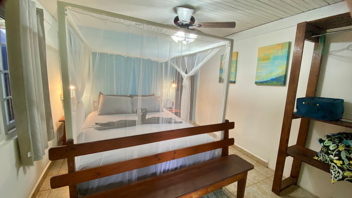 ¡Sin tarifas de servicio! Relájate en nuestra tranquila escapada a la isla ubicada justo encima del Caribe. Ubicado en la colina con vistas al océano, donde dormirás con los sonidos de la selva y las olas. La suite incluye una cama tamaño queen, un baño privado y una pequeña cocina al aire libre y una pequeña cocina al aire libre. Nuestra ubicación te pone en medio de tu propia aventura. Haz una corta caminata por la selva hasta playas onduladas o Old Bank. Estamos a 5 minutos en barco de restaurantes y clubes de Bocas Town. * Toda nuestra propiedad es PARA NO FUMADORES.*