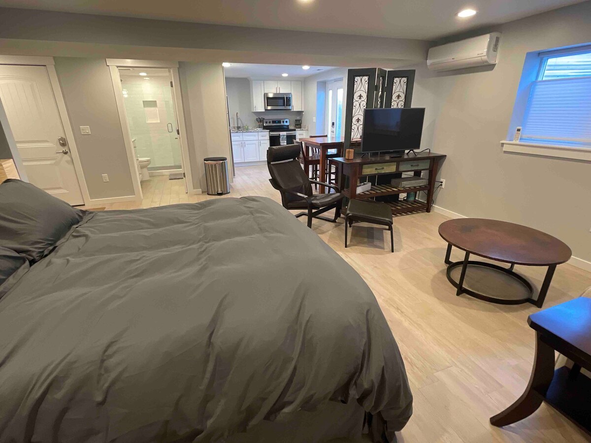 Apartamento estudio en el sótano recién reformado, privado y con entrada independiente. El espacio tiene una cocina y está totalmente amueblado para tus necesidades básicas, incluidos todos los elementos esenciales de cocina, ropa de cama, artículos de aseo básicos y toallas. Hay una cama tamaño queen y un sofá que se convierte en una cama individual. Excelente ubicación cerca de la autopista y cerca de la interestatal. Un espacio habitable acogedor, limpio y sencillo. Ve directamente a la propiedad y estaciona justo al lado de la entrada para facilitar el acceso de entrada y salida.