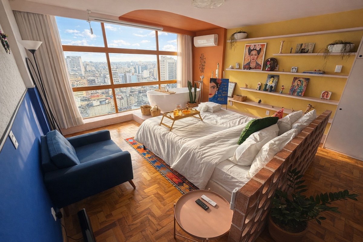Un secreto enclavado en el corazón de Pinheiros. Azotea 100% revitalizada en un edificio tradicional frente a la Praça Benedito Calixto, uno de los principales puntos turísticos de la ciudad, cerca de los principales atractivos de la región: ferias, bares, restaurantes, tiendas, plazas, galerías de arte. Con un estilo moderno y desenfadado, inspirado en el diseño industrial de las azoteas neoyorquinas, combinado con el alma y la materia prima típicas de la cultura brasileña. A menos de 7 minutos a pie del metro.