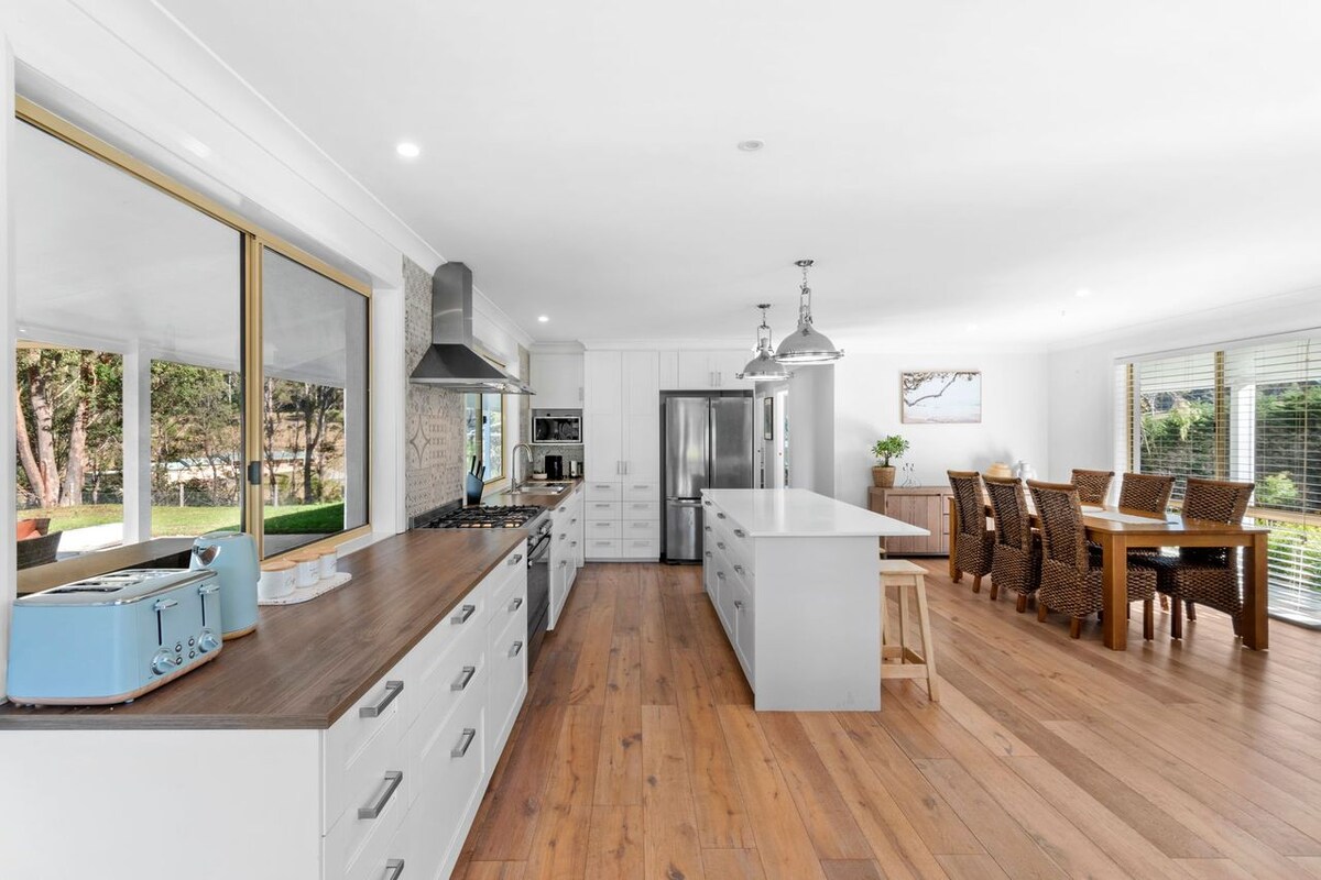 Nuestra casa se encuentra en un callejón sin salida tranquilo y acogedor a poca distancia a pie de la playa. Esta propiedad puede alojar a varias familias o grupos más tranquilos que deseen un descanso relajado en la costa juntos bajo el mismo techo... Estamos a pocos pasos de playas vigiladas y rampas para botes. Está a 6 minutos en coche o a 20 minutos en bicicleta de la ciudad. Hay senderos para caminar y andar en bicicleta rodeados de naturaleza, río y océano, y está céntricamente ubicado entre los senderos de bicicleta de montaña de Mogo y Narooma...