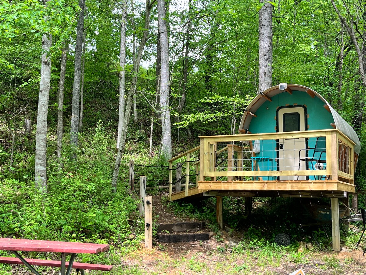 El Roundtop es un microglamper de 10' x 16' con porche protegido que se encuentra en la cima de una colina con vistas al estanque Cattail Springs. En su punto más alto, en el centro del techo redondeado, mide 6' 7" de alto y se inclina hacia abajo desde allí. Trae tu propio colchón hinchable y ropa de cama. Este microglamper incluye electricidad, mininevera, ventilador, dos sillas Adirondack, fogata y wifi. El baño portátil se encuentra cerca. Las duchas están convenientemente ubicadas a una milla del camping en la parada de camiones Pilot.