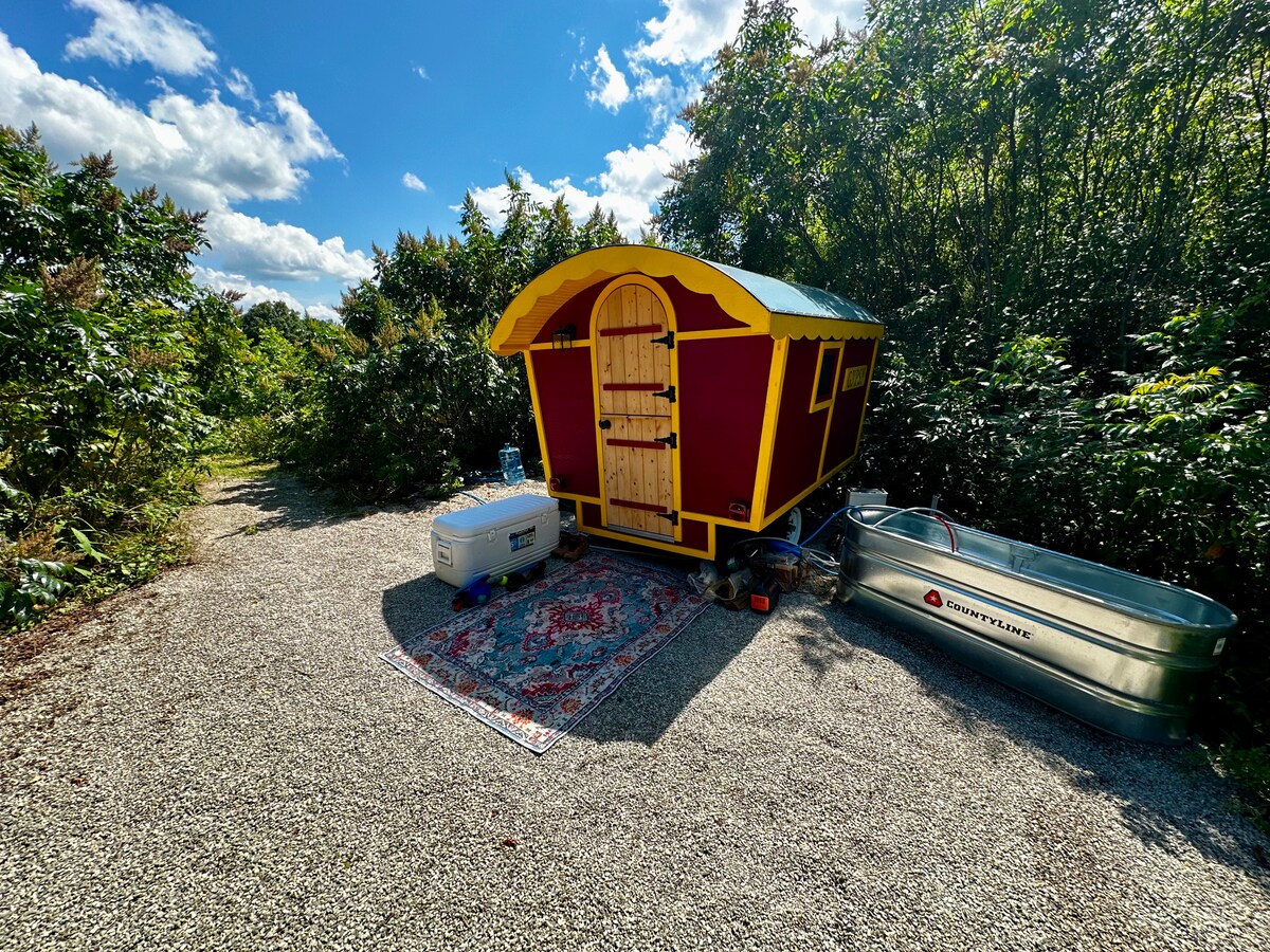 Nuestra cabaña de pastor/Vardo “Bohemian Betty” es una escapada divertida para un solo viajero, parejas o dos amigos. En plena naturaleza, encontrarás un espacio cubierto con una zona de cocina al aire libre. También hay una ducha exterior de agua caliente (de finales de abril a finales de octubre), una bañera de hidromasaje que se llena para cada huésped y un baño con lavabo. El sitio funciona completamente con energía solar y tu espacio tiene aire acondicionado, una mininevera y suministros de café y té, y una cocina al aire libre con fregadero.