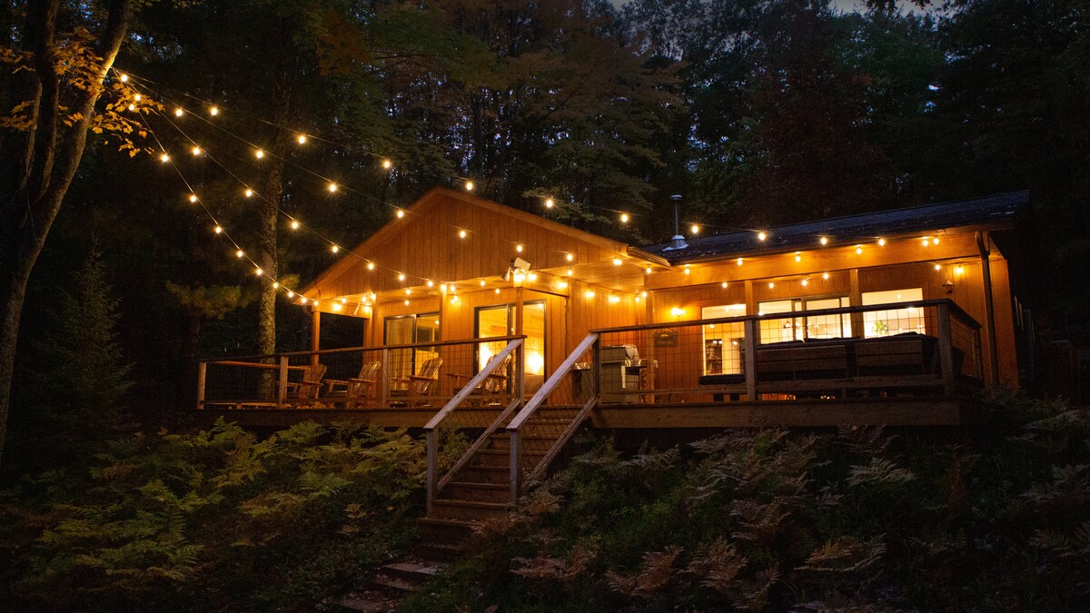 This lovely Bungalow on 5 acres is nestled along 1000ft of the Boardman River. We have kayaks, hammock, outside dining/living area with fireplace, and hot tub. The property is surrounded by state land and trails, perfect for hiking, kayaking, side by sides, and snowmobiling. The kitchen is fully stocked with basic condiments. The bathroom has towels, a hair dryer, small toiletries and soaps. WiFi will help you stay connected. Perfect for a honeymoon stay or couples getaway! 25 minutes to TC.