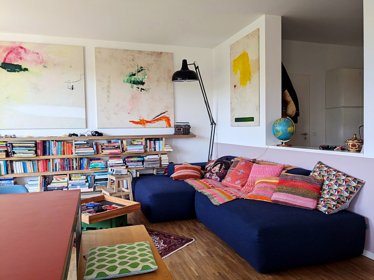 En lo alto de la casa de la esquina amarilla junto al parque: ¡Muchos metros cuadrados y la posibilidad de alojar hasta 12 huéspedes te permiten conquistar y celebrar Berlín con toda la familia y amigos de aquí! Un estudio de pintura en el ático, construido por ti mismo. Somos artistas y diseñadores y hemos instalado una sala de pintura, un dormitorio, una gran cocina: sala de estar, un baño de bienestar y una sala de invitados y juegos. ¡Este es tu alojamiento!