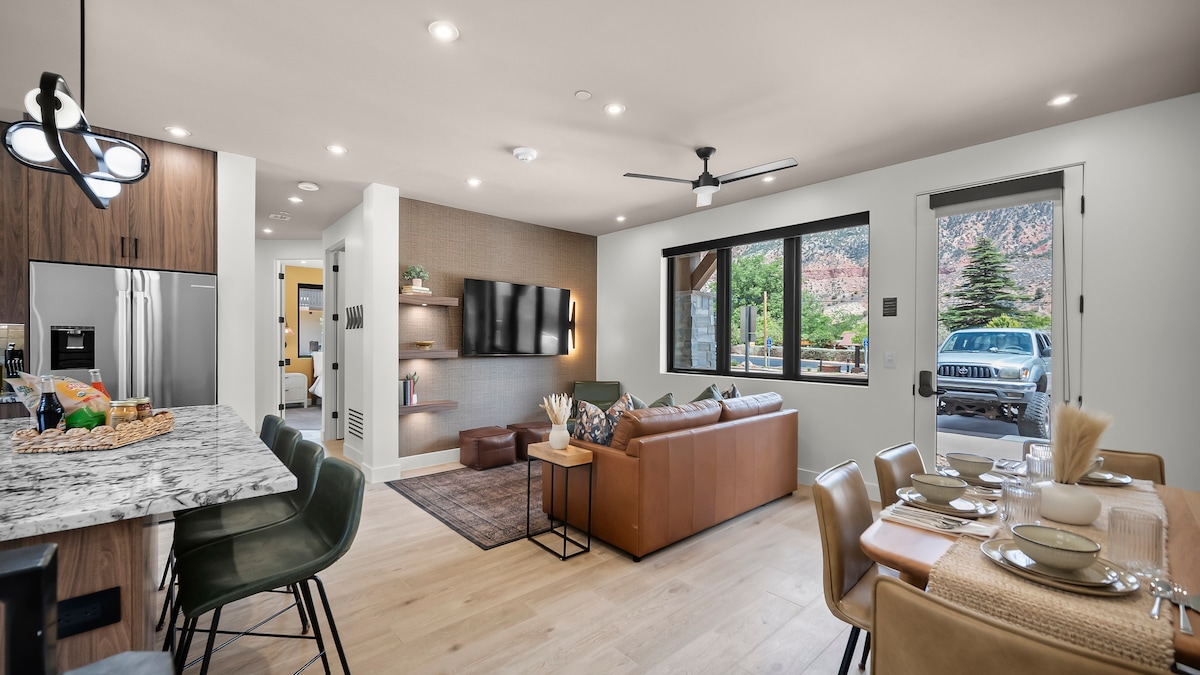 Don't just hike Zion, wake up to it! Set on 2 acres & backing public-access canyonlands, a floor-to-ceiling window wall frames iconic Zion views straight from bed, there's no other stay like it. Soak in your private hot tub, stargaze from the observation deck & grill fireside. Have a pet? Bring them along! Located 45 min from Zion National Park & 2 hours from Bryce Canyon, this Southern Utah stay puts red-rock views & rare direct BLM canyon trail access within reach.