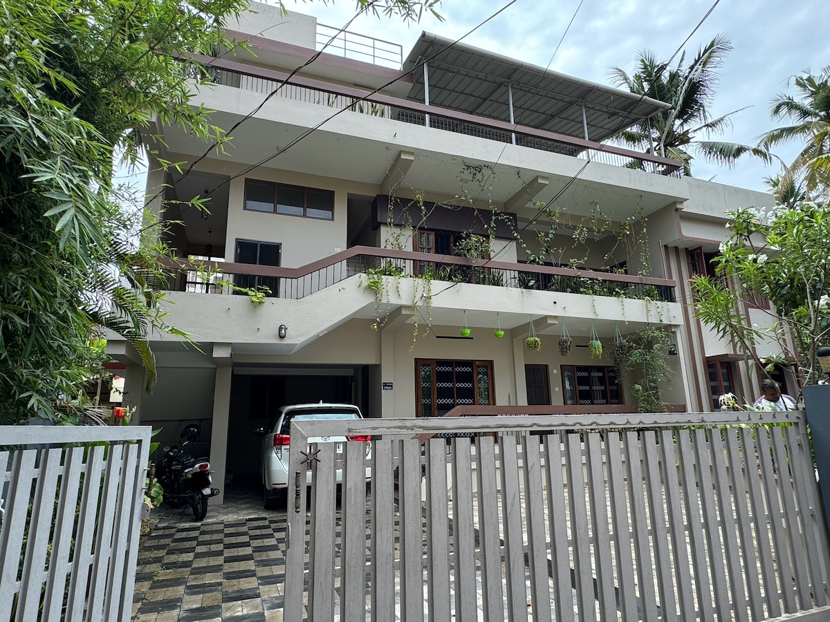 ¡Te damos la bienvenida a Padnamabham, tu retiro sereno en Trivandrum! A solo 5 minutos del aeropuerto de Trivandrum y del templo Padmanabha Swamy, y a 20 minutos de la playa de Kovalam, nuestra villa de 3 BHK totalmente amueblada es ideal para estancias largas. Disfruta de comodidades modernas, como una acogedora sala de estar con TV de 55 pulgadas, wifi de alta velocidad y cocina totalmente equipada. Relájate en el amplio balcón rodeado de vegetación, perfecto para relajarte después de explorar las mejores atracciones de Trivandrum.