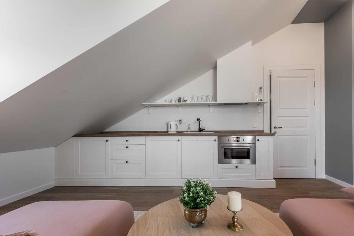 Disfruta de este estudio único y elegante a solo unos pasos del corazón del casco antiguo de Vilna. Rodeado de encantadores cafés, acogedores bares, un mercado de comida interior y un parque con excelentes vistas de Vilna, este estudio de 38 metros cuadrados incluye una cocina totalmente equipada, wifi de muy alta velocidad (500 MB/s), un televisor con Netflix y una cómoda cama doble. Ubicado en un edificio patrimonial de 120 años, a solo cuatro paradas de autobús del aeropuerto de Vilna y a 10 minutos a pie de la estación de tren/autobús.