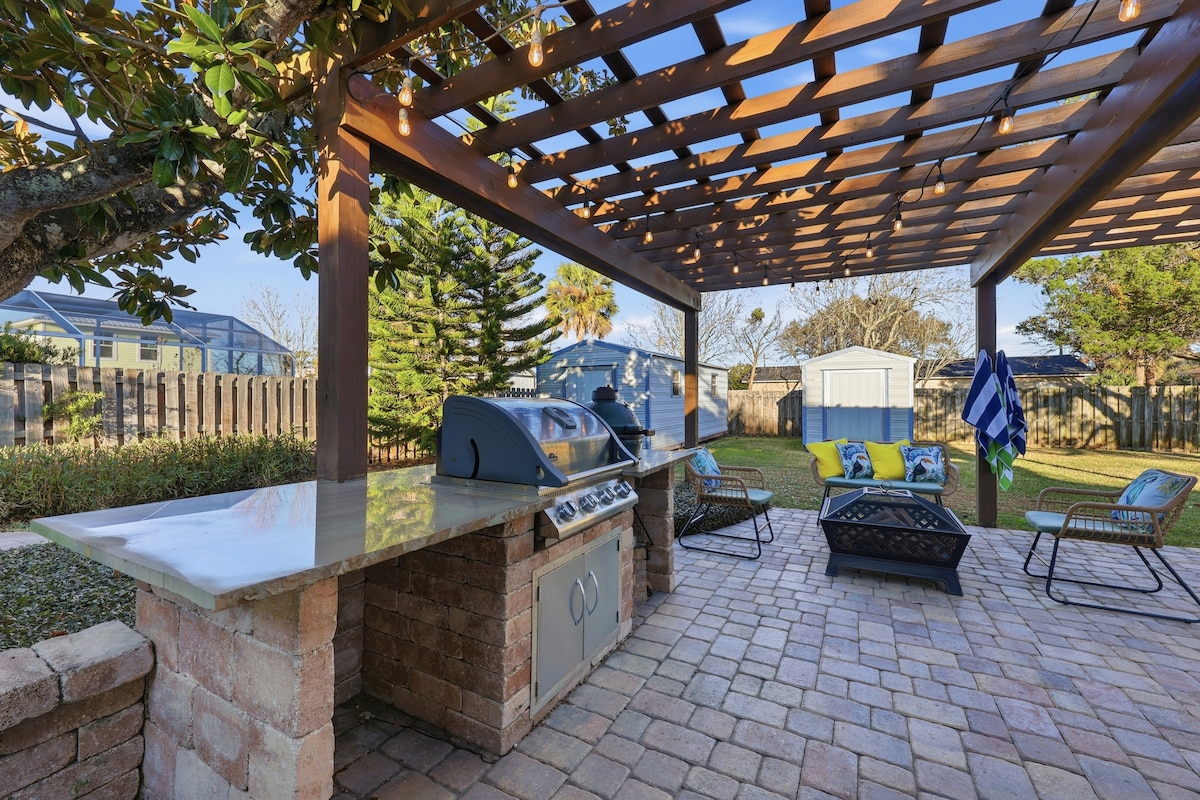 ★ ESCAPE JUNTO AL MAR. ★ Recién actualizado: esta encantadora casa de inspiración costera se encuentra a una casa del mar, en una tranquila calle sin salida en la playa Crescent, ideal para familias. ✔ Nuevo paseo marítimo/acceso frente a la casa. Bañera de hidromasaje/spa para✔ 10 personas, nuevo bar Tiki y parrilla de gas. ✔ 3 cómodos dormitorios (4º loft privado adicional para dormir) y 2,5 baños completos. A ✔ poca distancia en coche del centro de St. Augustine (15 min). Garaje de✔ juegos con TV inteligente, mesa de alta gama y futbolín. ✔ Equipado con 5 televisores inteligentes e internet de alta velocidad.