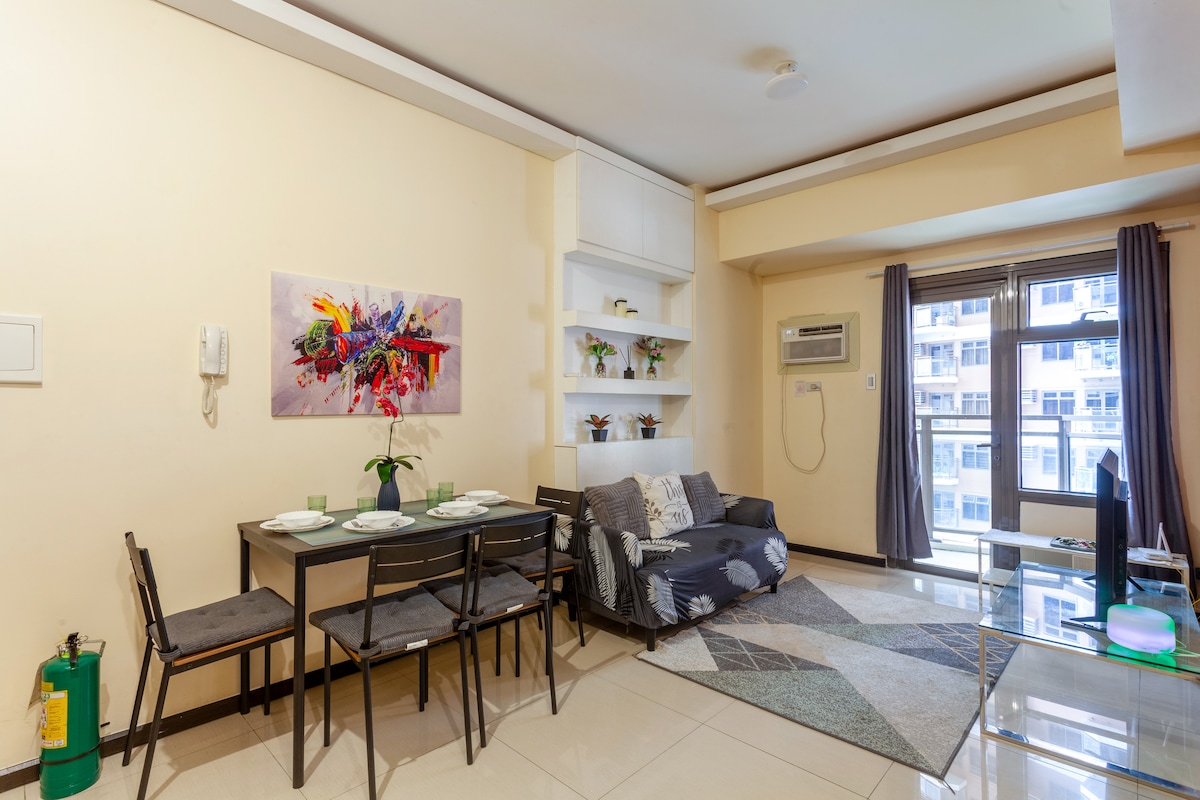 Moderno y espacioso 1BR con balcón y piscina a pocos kilómetros del aeropuerto y a pocos pasos de numerosas atracciones en el área de la bahía de Manila. Cocina bien equipada, sala de estar iluminada por el sol, cama cómoda, wifi, Netflix, aire acondicionado y TV tanto en la sala de estar como en el dormitorio. Alojamiento perfecto para parejas, familias pequeñas o viajeros de negocios. Sauna y zona de juegos para niños: uso gratuito Piscina: gratis hasta tres invitados; 200 PHP por cada invitado adicional.