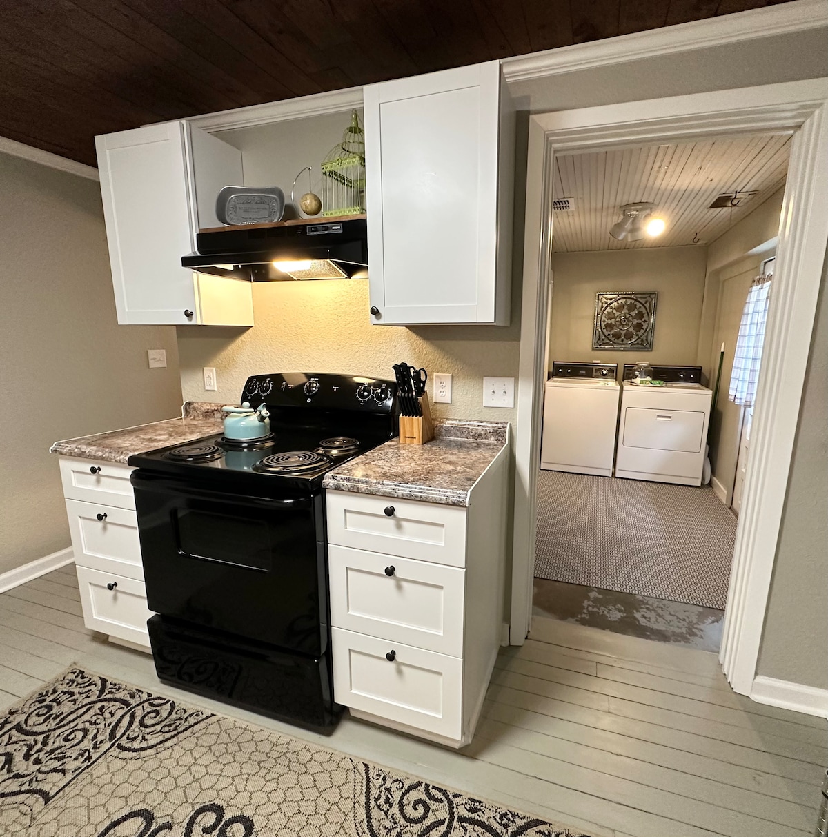 Esta encantadora casita de campo es de nueva construcción, diseñada en el estilo «industrial farmhouse chic». Es el lugar perfecto para una escapada romántica o una relajante aventura en el campo. ¡Disfruta de las vistas arboladas desde el porche trasero, camina hasta el lago o disfruta de un día en el centro de Granbury! Si tienes suerte, puede que incluso veas al correcaminos del barrio. ¡Le encanta usar nuestro porche trasero como escondite!Nos encantaría tenerte, así que ven y quédate un tiempo.