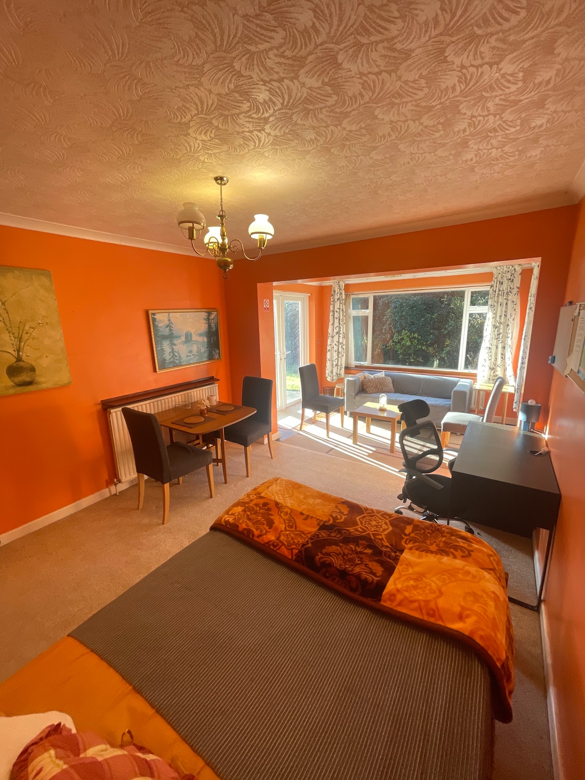 Bright, self-contained annexe on the 1st floor with private entry and lockbox for easy check-in. Features a king-size bed, sofa bed, dining area, and kitchenette with fridge/freezer, toaster, and tea/coffee facilities (no hob/oven). Mezzanine with two single beds, accessed by stepladder with lockable gate. Modern ensuite with shower and fresh towels. 42” TV with Netflix (no terrestrial TV). Private parking for 2–3 cars. EV charger available on request for a fee.
