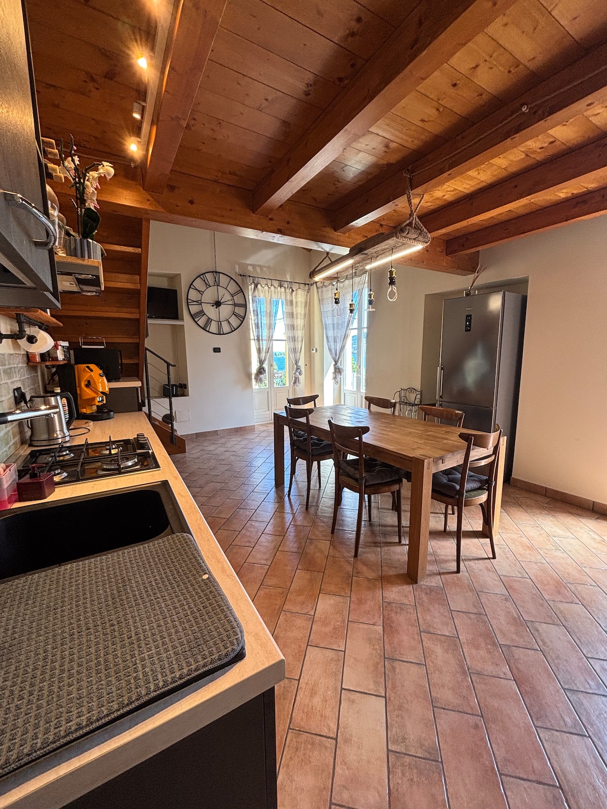 La renovación de la antigua granja de la abuela dio como resultado una casa grande compuesta por dos departamentos. En el piso de arriba se encuentra el departamento grande, que cuenta con una zona combinada de cocina y sala de estar, dos dormitorios amplios, dos baños con bañera y ducha, y tres balcones. En particular, desde la terraza de la sala de estar, se puede contemplar el lago y sus tres islas; aquí se puede almorzar mientras se disfruta de la vista.
