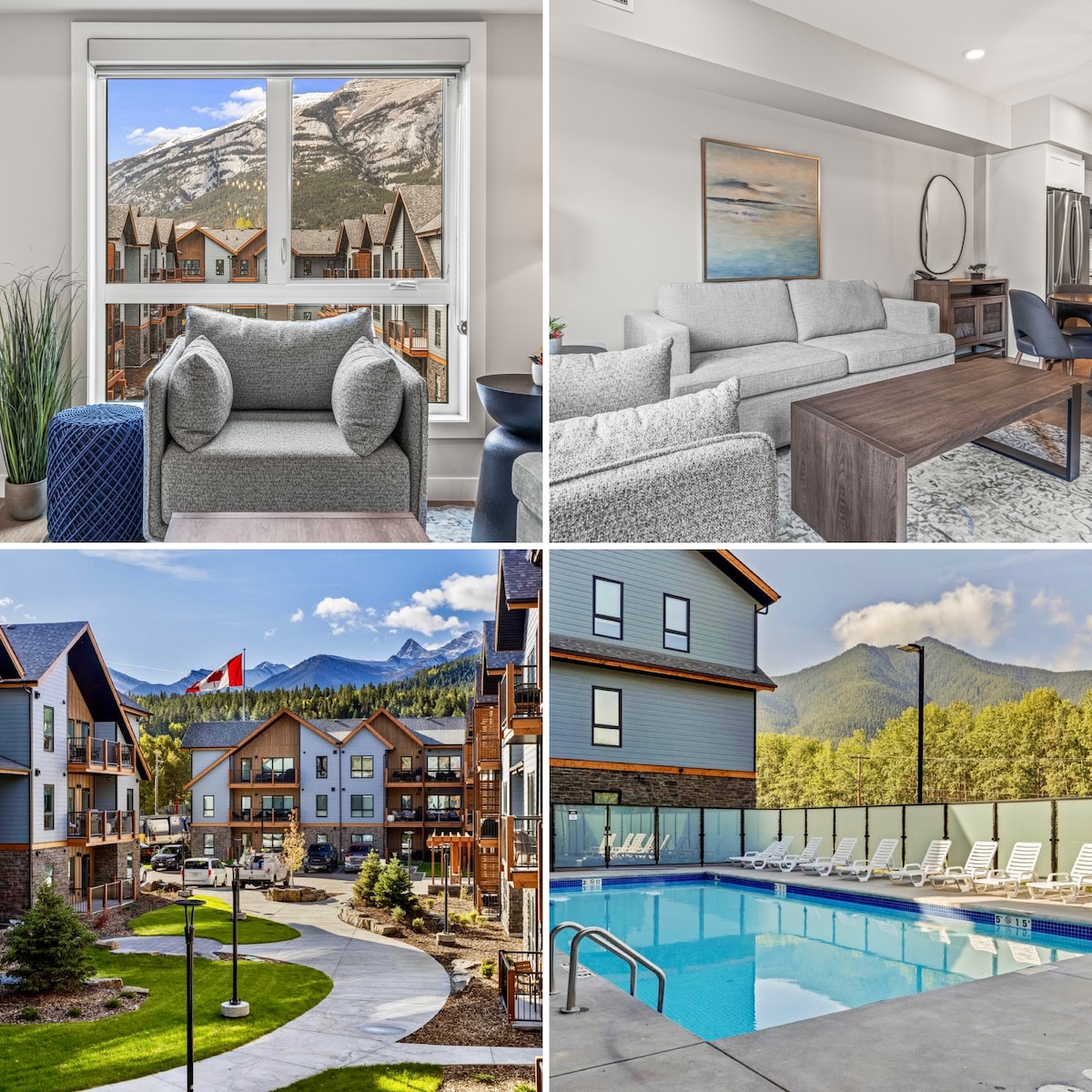Welcome to this stunning, 1 bed 1 bath property, located in the heart of Canmore, Alberta. Surrounded by the best mountain views in Canmore, this property offers breathtaking views of the Three Sisters, Mount Lawrence Grassi, and the whole Rundle mountain chain. After a long day, come home to soak in one of the outdoor hot tubs, relax in front of the electric fireplace or sit on our sunny balcony and enjoy the view.