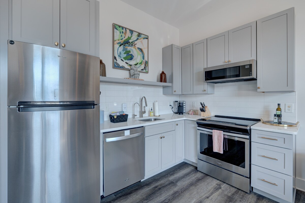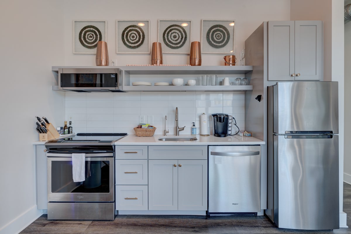 Esta suite king apta para mascotas tiene grandes ventanales, decoración visualmente cautivadora y arte original, techos altos, una hermosa cocina completa con encimeras de cuarzo y electrodomésticos de acero inoxidable, cómoda sala de estar y comedor, una gran ducha a ras de suelo y sábanas de lujo. Juntos, la decoración de moda y el arte transforman esta suite en un espacio visualmente cautivador y atractivo para relajarse, proporcionando a los huéspedes una experiencia inmersiva e inolvidable que va más allá del mero alojamiento.