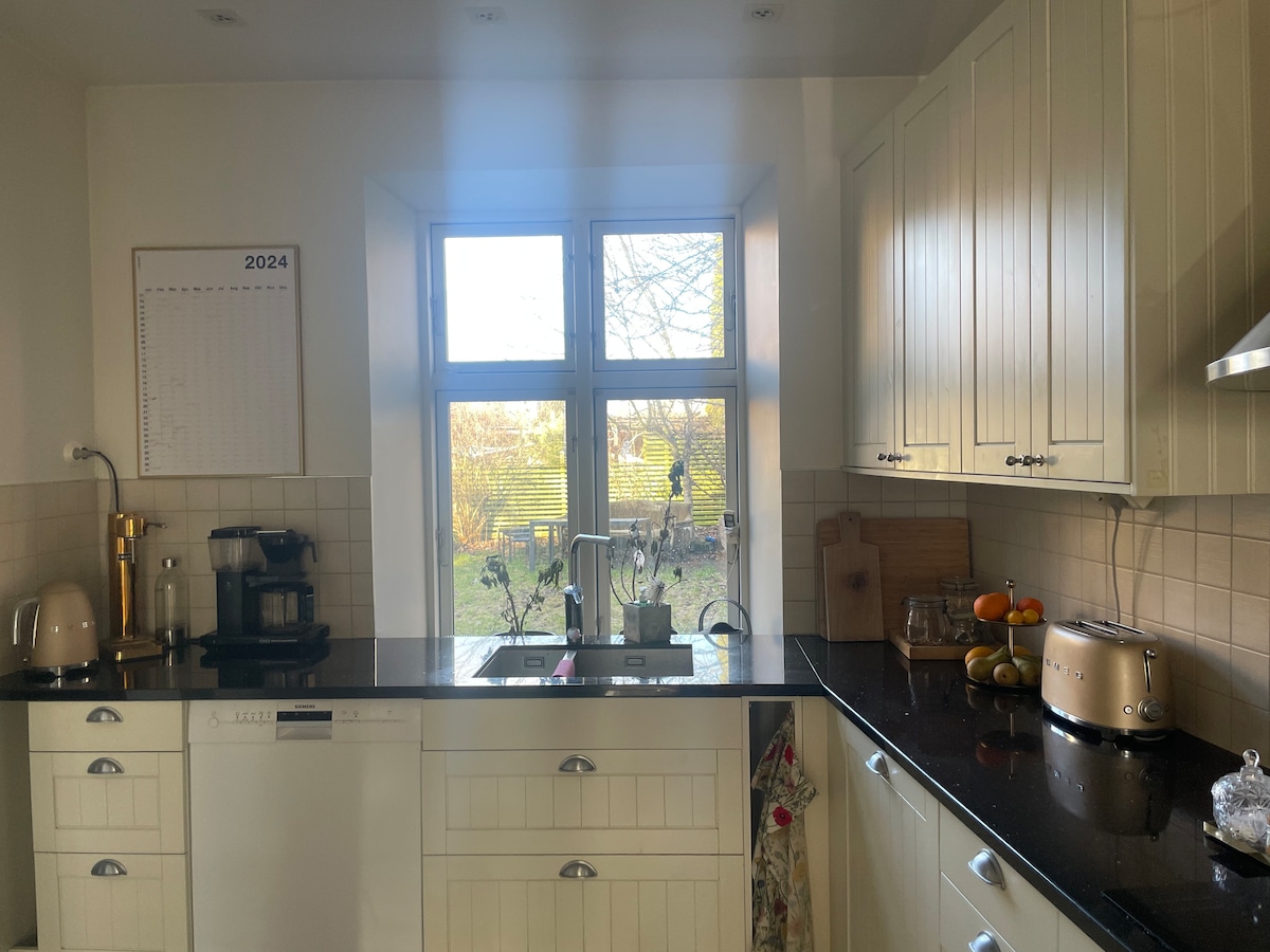 La casa se encuentra en una zona tranquila y cultural protegida en el centro de Landskrona. El aparcamiento se puede realizar en la zona, pero no es gratuito, pero CUESTA SEK2/hora las 24 horas, los 7 días de la semana. El departamento está ubicado en el primer piso de una casa de dos familias, donde vive la pareja anfitriona en el departamento de arriba. La zona es de unos 74 metros cuadrados, divididos en cocina, baño, dormitorio con cama doble y dos salones, uno de los cuales es un sofá cama. La granja es exuberante y acogedora y ofrece varias zonas para sentarse.