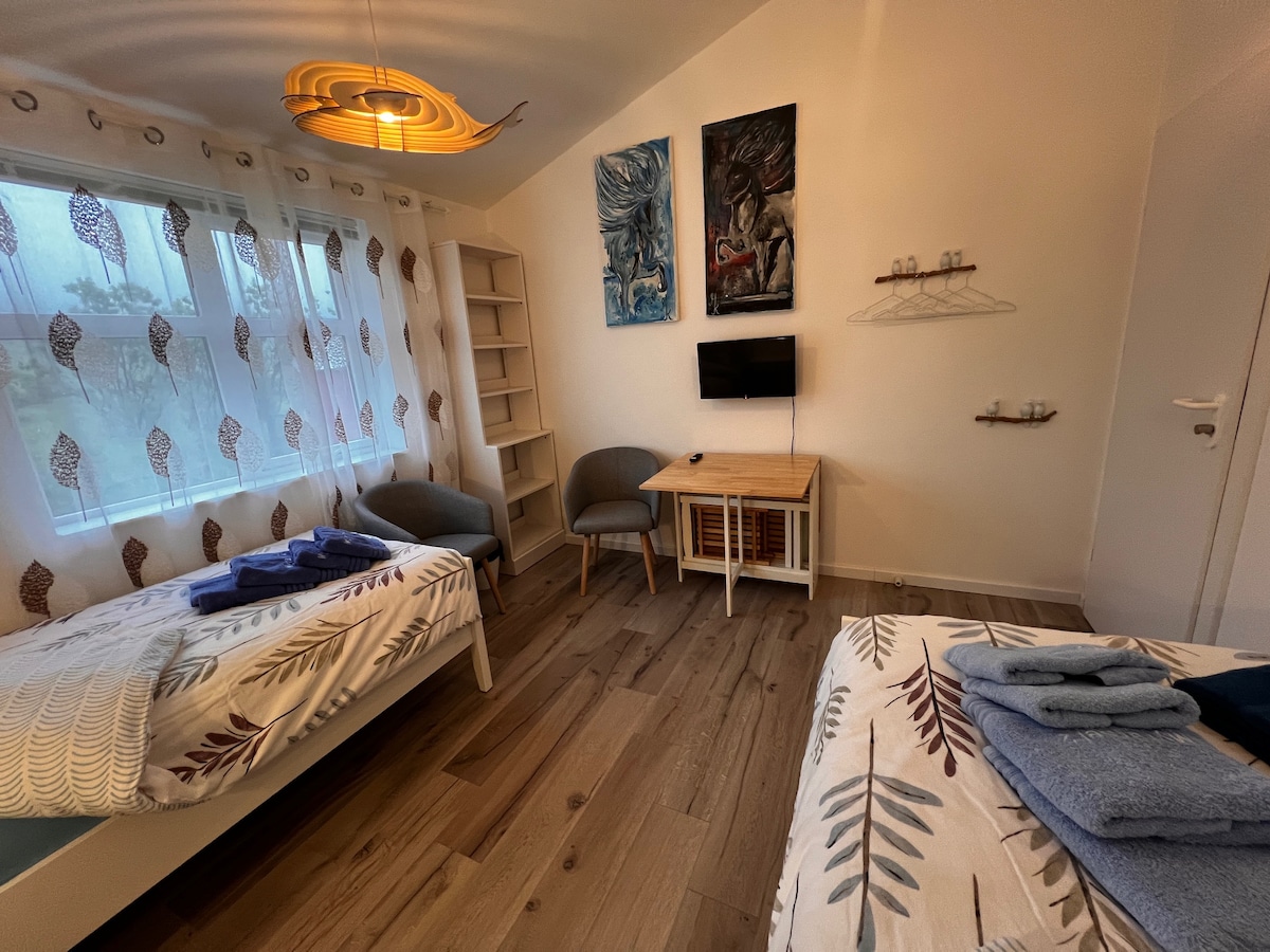 Pequeño y acogedor apartamento tipo estudio, de unos 30 metros cuadrados, en una zona residencial tranquila. Tiene su propia entrada, separada de la de los propietarios. La cama mide 1,6 x 2 metros. Puedes aparcar justo al lado de la puerta. Cuando hace buen tiempo, puedes sentarte fuera en el patio trasero privado. Hay lugares importantes cerca: la piscina, la panadería y la tienda de descuento están a 900 metros, la carretera principal 1 está a 800 metros y el centro de la ciudad está a 1,2 kilómetros.
