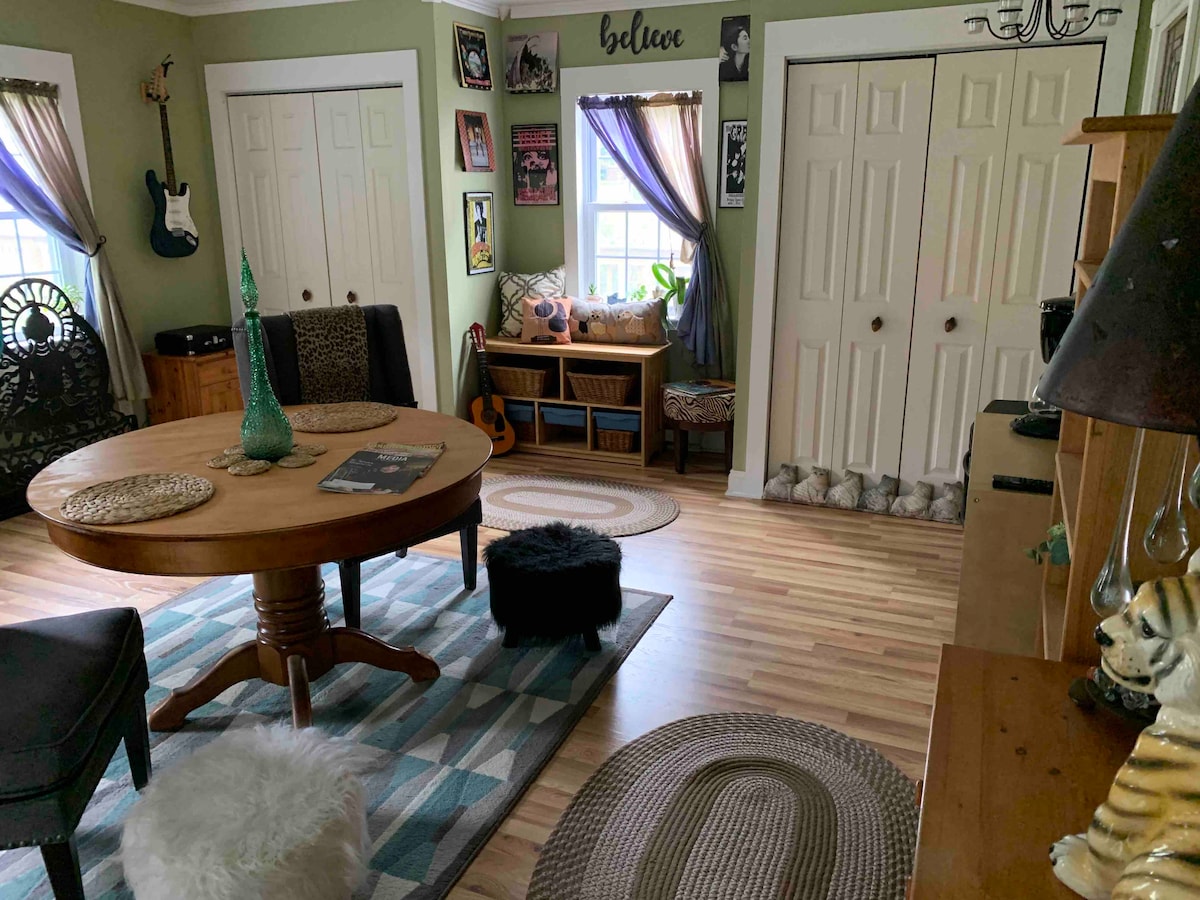 Apartamento en el segundo y tercer piso. El apartamento incluye un dormitorio principal con una cama de matrimonio y un dormitorio de invitados con 2 camas individuales. Baño privado. Hay un comedor con nevera, fregadero, microondas, horno tostador de convección de inducción, cafetera, mesa de comedor con prensa francesa, Alexa y TV LCD. El comedor NO tiene COCINA. Sala de meditación en el tercer piso con claraboyas y sala de estar con pantalla LCD. TODA LA ZONA DEL APARTAMENTO ES PRIVADA. La casa da al bosque y al jardín trasero. SIN GASTOS DE LIMPIEZA.