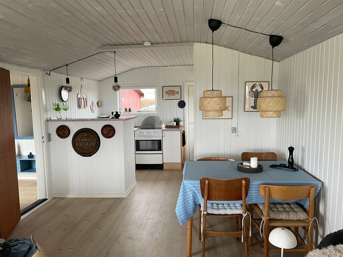 Family friendly summer house with ocean view on large undisturbed property. Perfect for a small getaway in the nature and by the sea. Newly renovated in all wood material and natural colors creating a cozy and homely atmosphere. Room 1: Small double bed (140 cm) Room 2: Two built-in single beds and one junior bed Room 3: Two bunk beds, or convert the lower bunks into a double bed with two single beds on top. You will find the mattress for the double bed stored in the cabins under the beds.