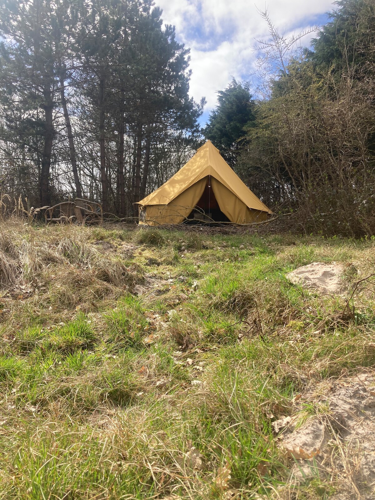 Disfruta de los sonidos de la naturaleza cuando te hospedes en este lugar único. Desde la tienda se puede contemplar los campos y las rosas silvestres. Además de 2 adultos, pueden alojarse 3 niños. Duermen en un colchón para niños en el suelo. Cuando haga calor, abre todas las ventanas para que la tienda se ventile. También tienes una nevera, cafetera de filtro, hervidor de agua, cocina de gas con 3 fuegos, platos, tazas y cubiertos, barbacoa, cesta de fuego. Wifi gratuito en el edificio sanitario.