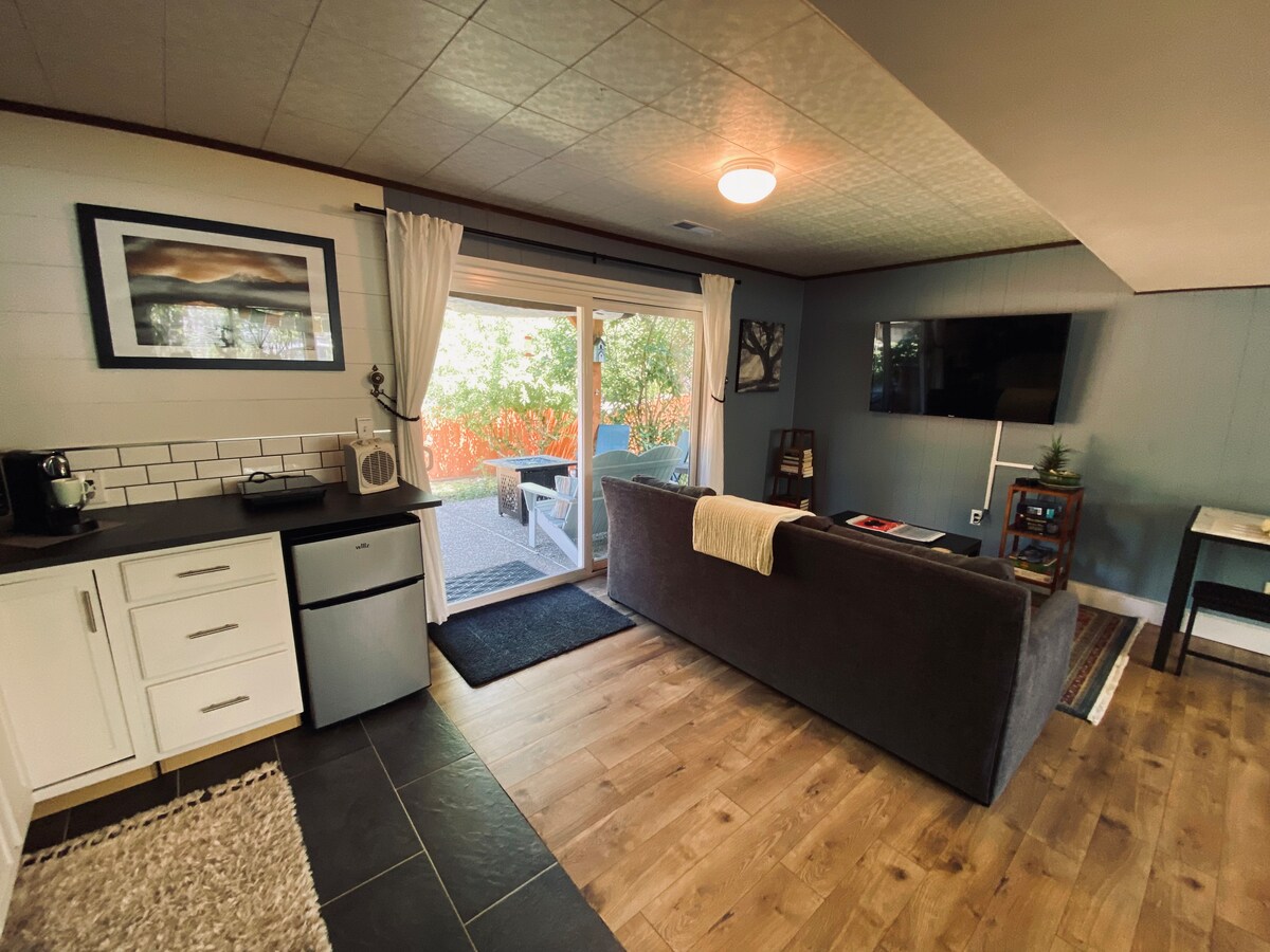 Suite en el sótano de un estudio privado. Entrada privada/patio trasero. Cama con colchón tamaño queen con la parte superior acolchada. El sofá cama nido de alta gama es tamaño queen para el perdedor del lanzamiento de moneda Baño privado/lavandería. 2 televisores inteligentes para streaming Cocina americana: nevera, congelador, microondas, placa de cocción de un quemador. Café, té, avena. Gran deslizador al patio con mesa de fuego y asientos. Patio trasero de césped vallado. Tenemos 2 perros que pueden ladrar ocasionalmente durante las horas normales del día. Vivimos arriba, espera el ruido normal de la vida durante las horas no tranquilas. Mascotas = tarifa de 50 USD